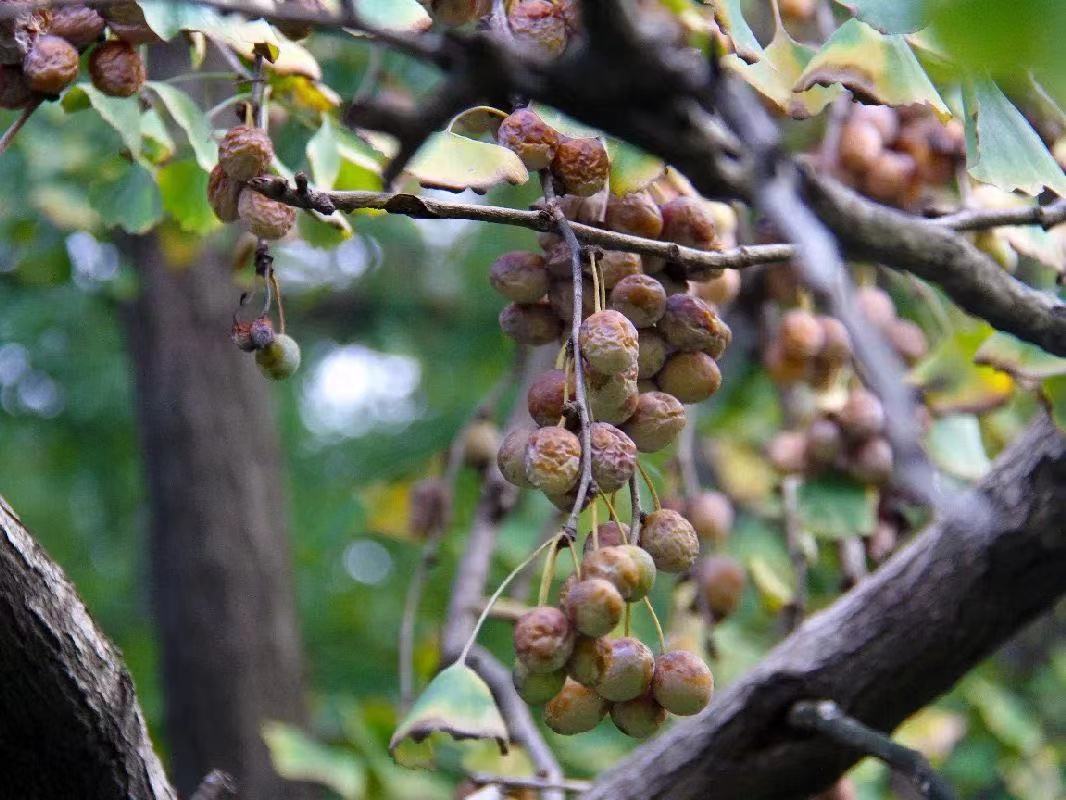 银杏的果实如一颗颗黄色的金桔缀满枝头,但它的外种皮却具有浓烈气味,让人不甚喜爱。