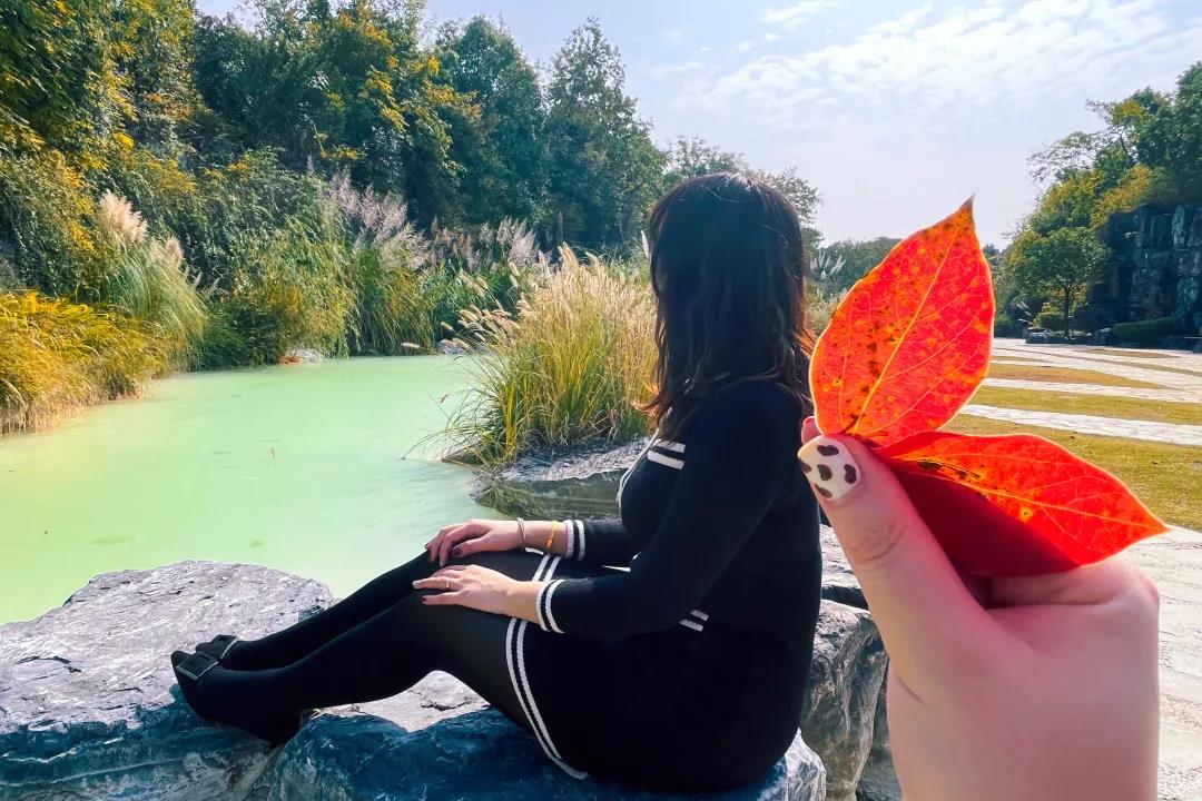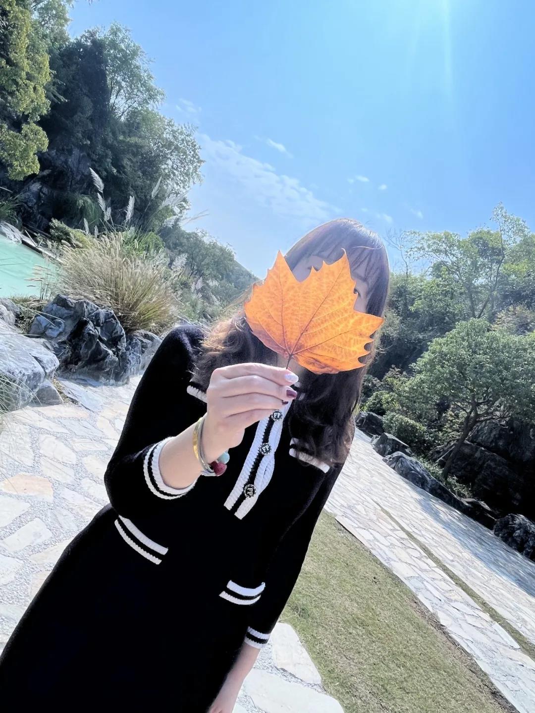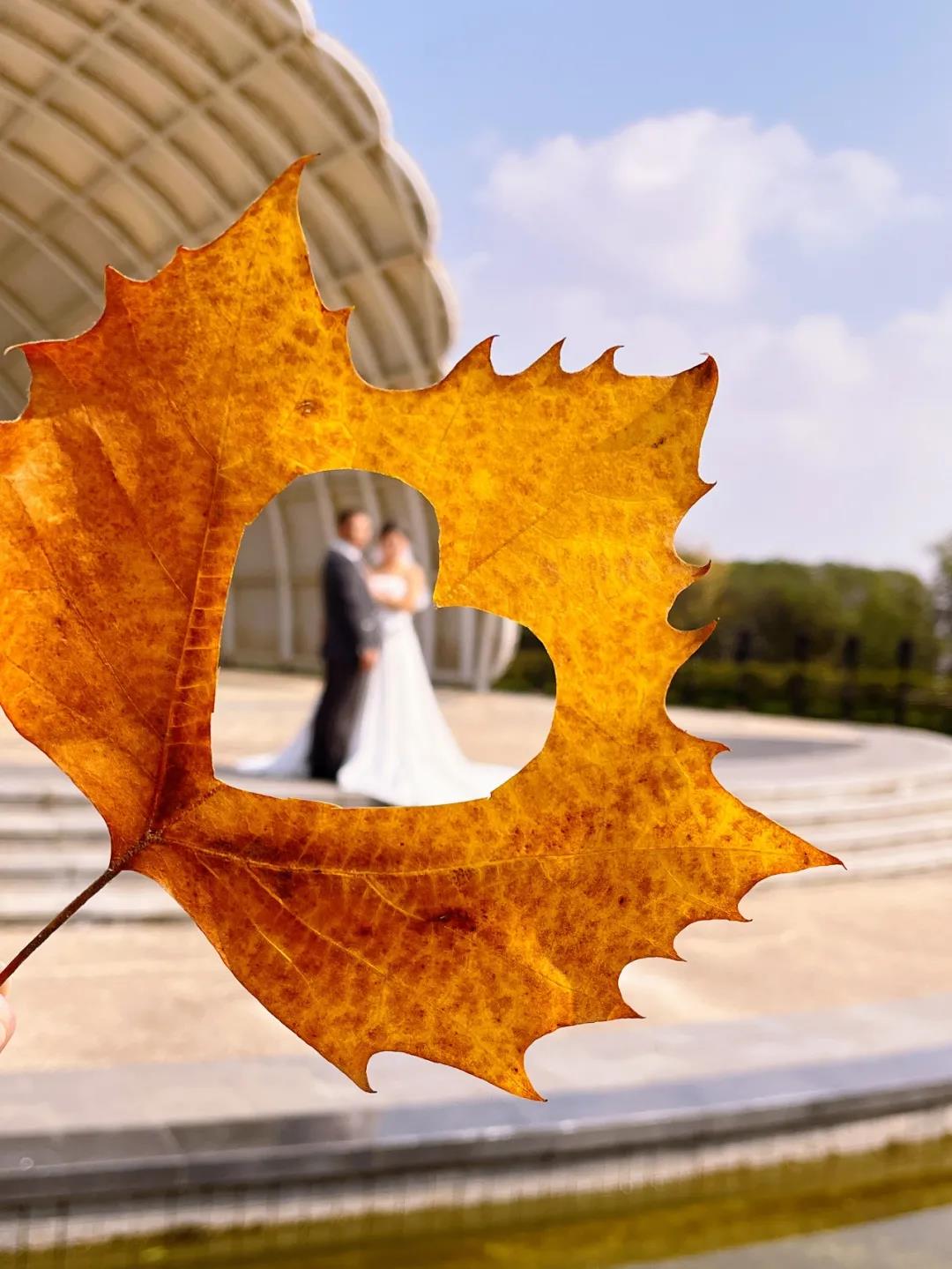秋天拍照,树叶是最好的拍摄道具。借助一片好看的秋叶作为前景的遮挡物,这对于一些喜欢拍秋天人像照、但却不敢面对的小伙伴来说,是比较好的拍照方式。