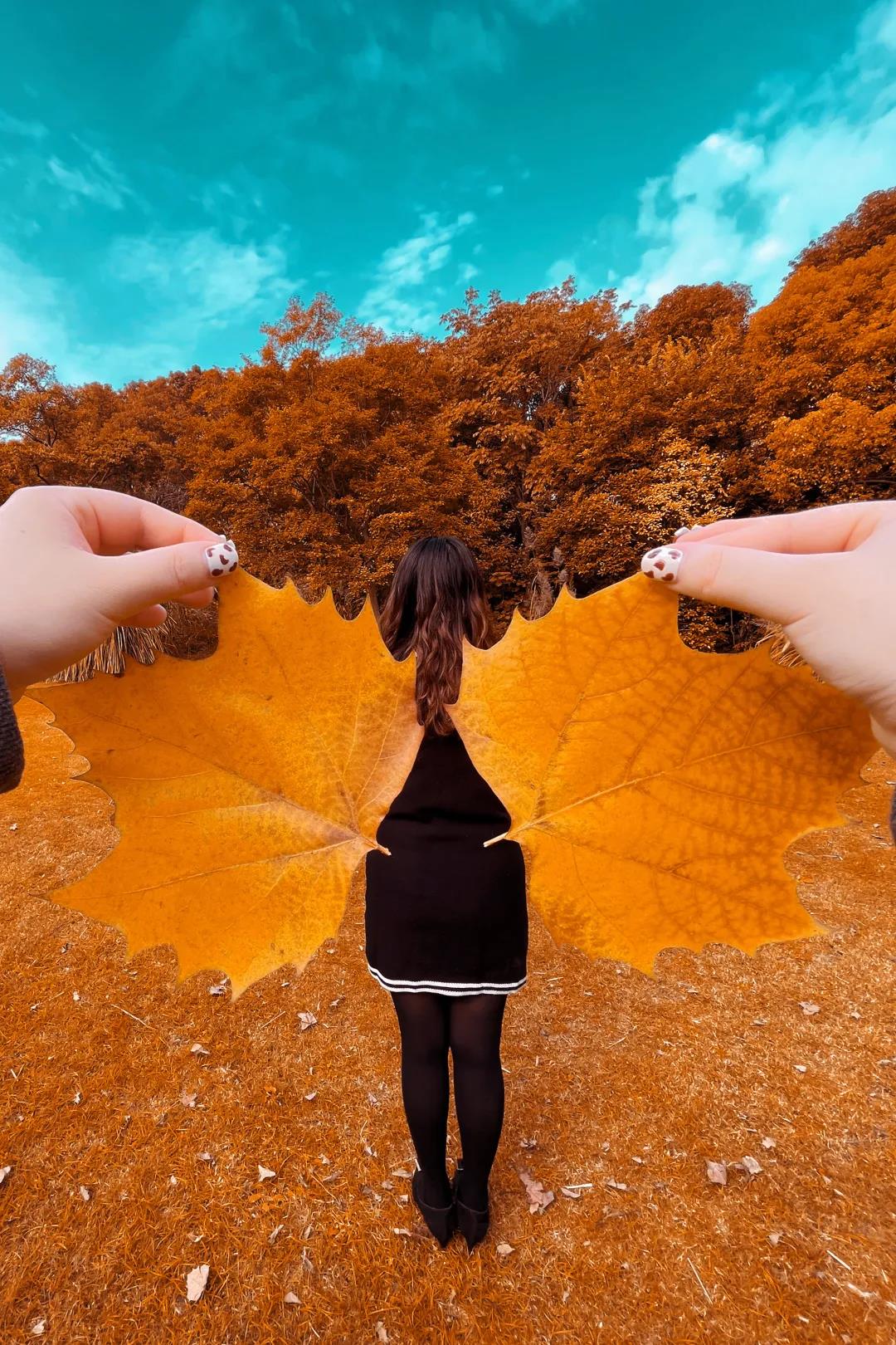 秋天的树叶大多以暖黄色调为主,加之其细节纹理及独特的形态,与人像结合进行错位拍摄,拍出来的照片有趣而浪漫温馨,传递出秋日的美好。