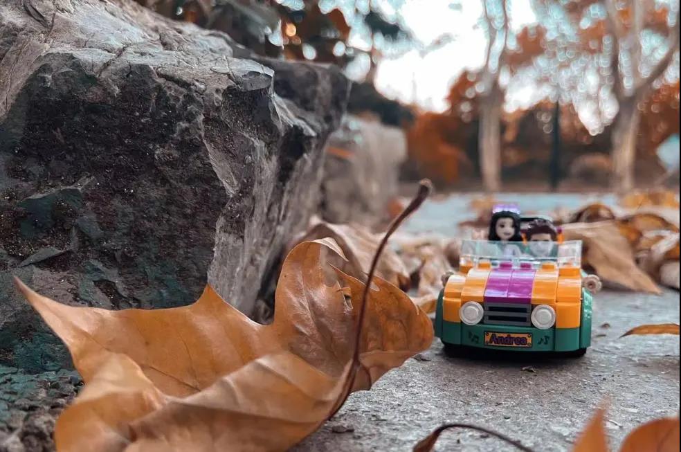 找一处落叶较多的地方,利用身边的一些小玩意儿,可以是微缩景观的一些小人偶,也可以是身边能找到的一些其他小物件。