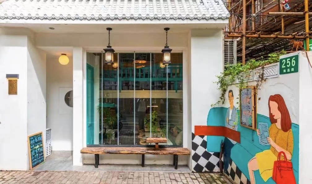 通过涂鸦,商铺也和街区完美联结。在“半舍”新店门口,一段Tiffany蓝融合简约复古风的涂鸦弄堂已成为南昌路上不容错过的一抹亮色。坐在“半舍”一楼的临街位置可以慢慢欣赏这条不缓不急的南昌路,坐在二楼的阁楼式靠椅上,俯瞰视角则又是另一番别样的感受......烟火和艺术在这里是如此相宜。
