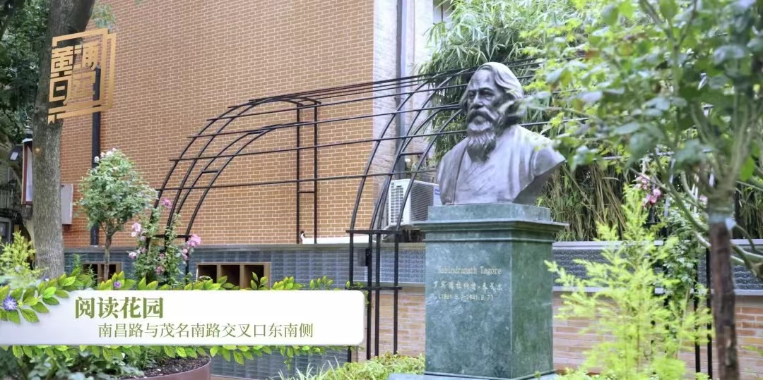 阅读花园与书店联合共建,通过汀步园路、阅读廊架、琉璃书墙,休憩空间,打造小巧而精致的阅读空间,抬高的花坛与泰戈尔雕塑相称。