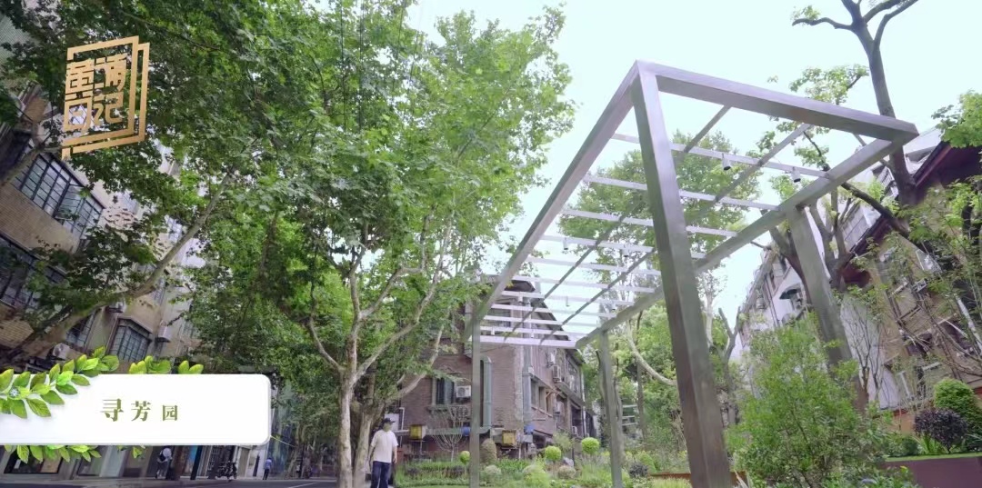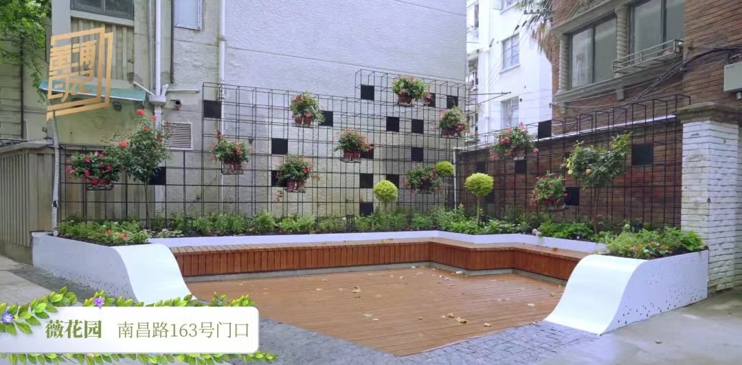薇花园因地制宜,布置耐荫花卉,在建筑墙体间增加花架嵌体与木质坐凳,并且通过社区居民参与绿植认养,实现共治共享。