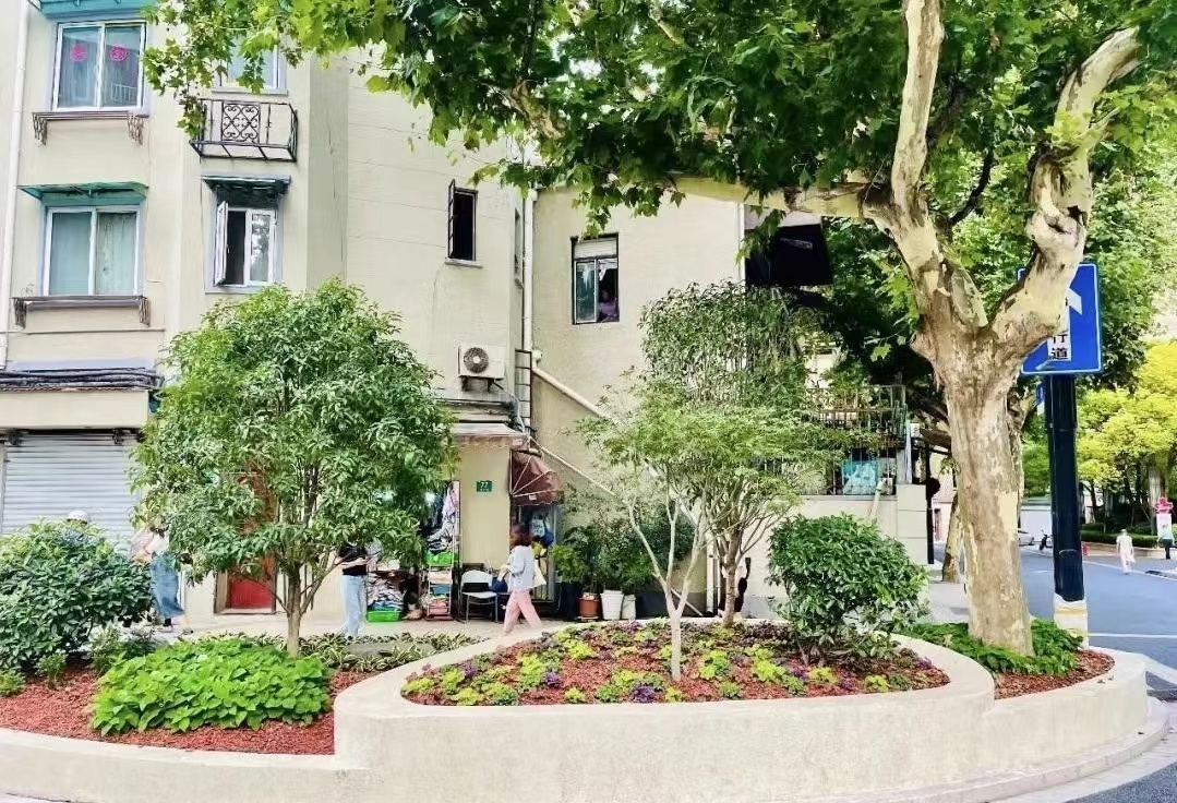南昌路雁荡路的转角绿地拥有精致的花坛花境、细腻的表面装饰。