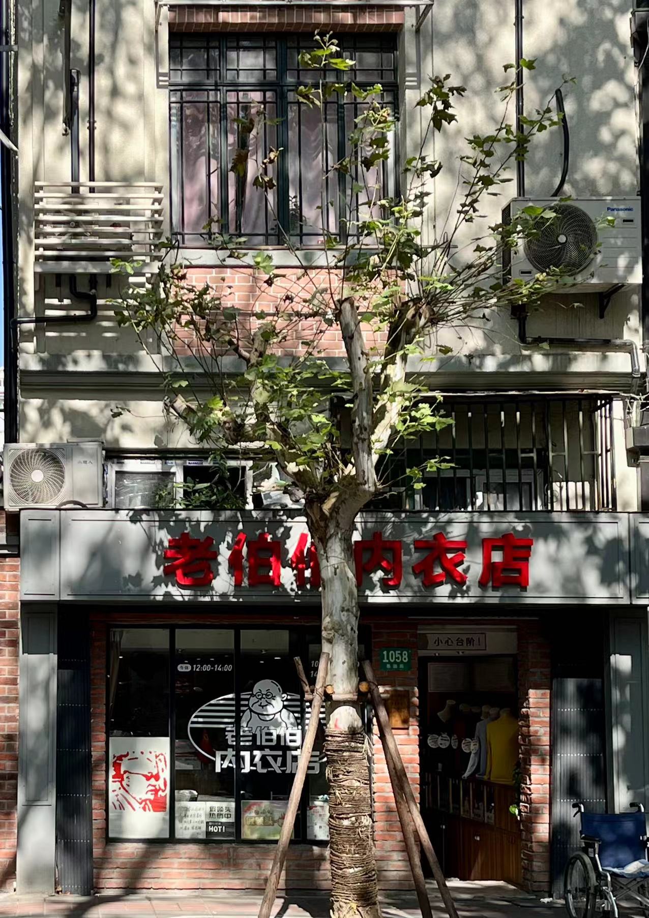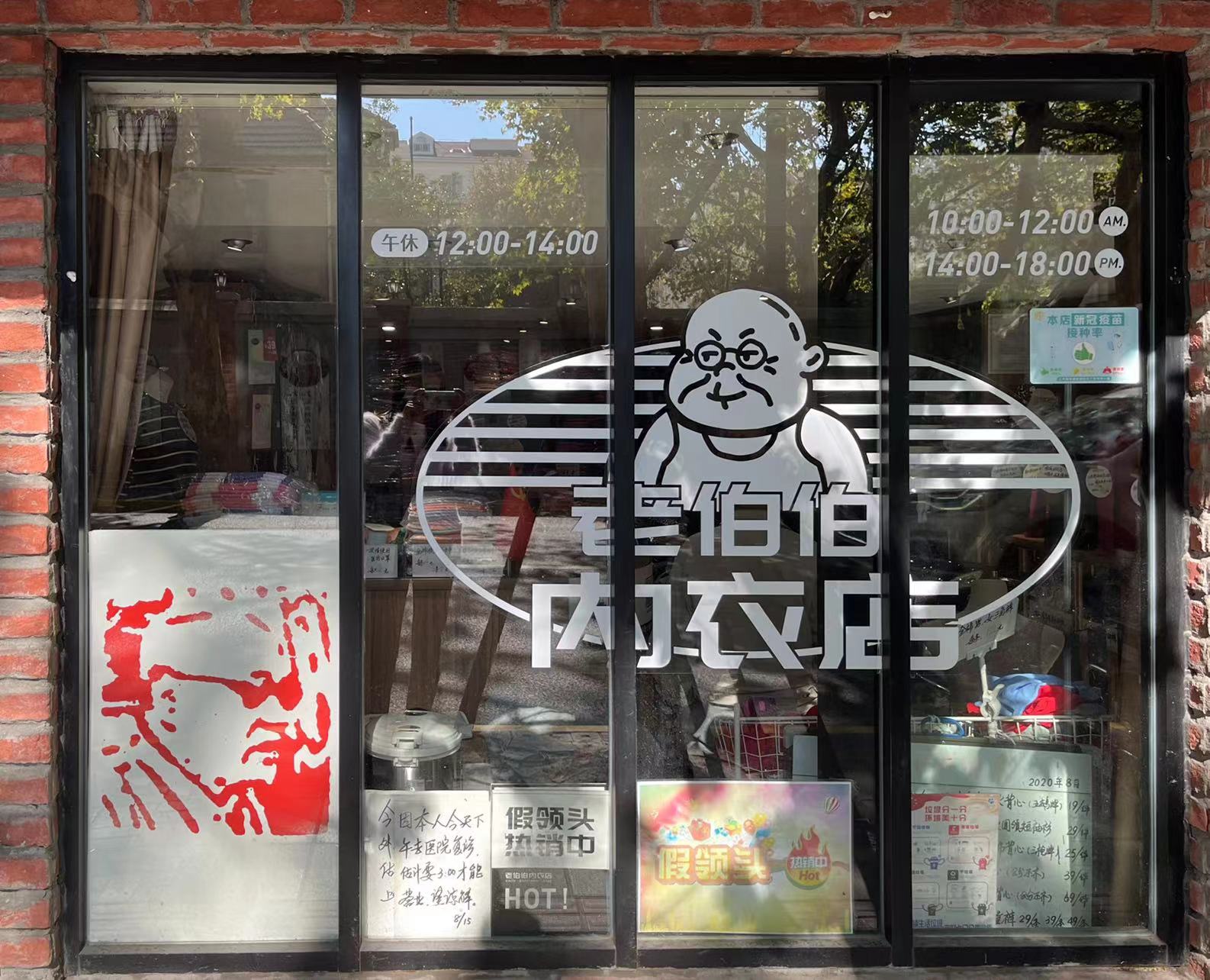 带着还未散去的草莓香气往前走,笔者立马被一家店的门头吸引。“老伯伯内衣店”橱窗上的“光头老伯”卡通画惟妙惟肖,“假领头热销中”的字眼也让笔者的兴趣油然而生。