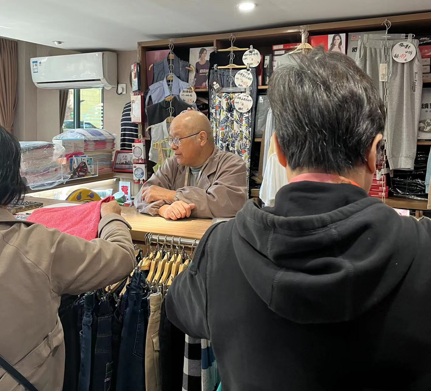 “喔唷,孙子孙女现在都不要穿棉毛衫、棉毛裤的,我们老年人要穿的,这家店质量好、价格便宜。”一位爷爷道。一位瘦小的95岁奶奶也颤颤巍巍地来买棉毛内衣,“这是85公分的,最小了!”老伯拿了套“五鹅牌”棉毛内衣递给她,在耳背的她的面前笑着提高了分贝……
