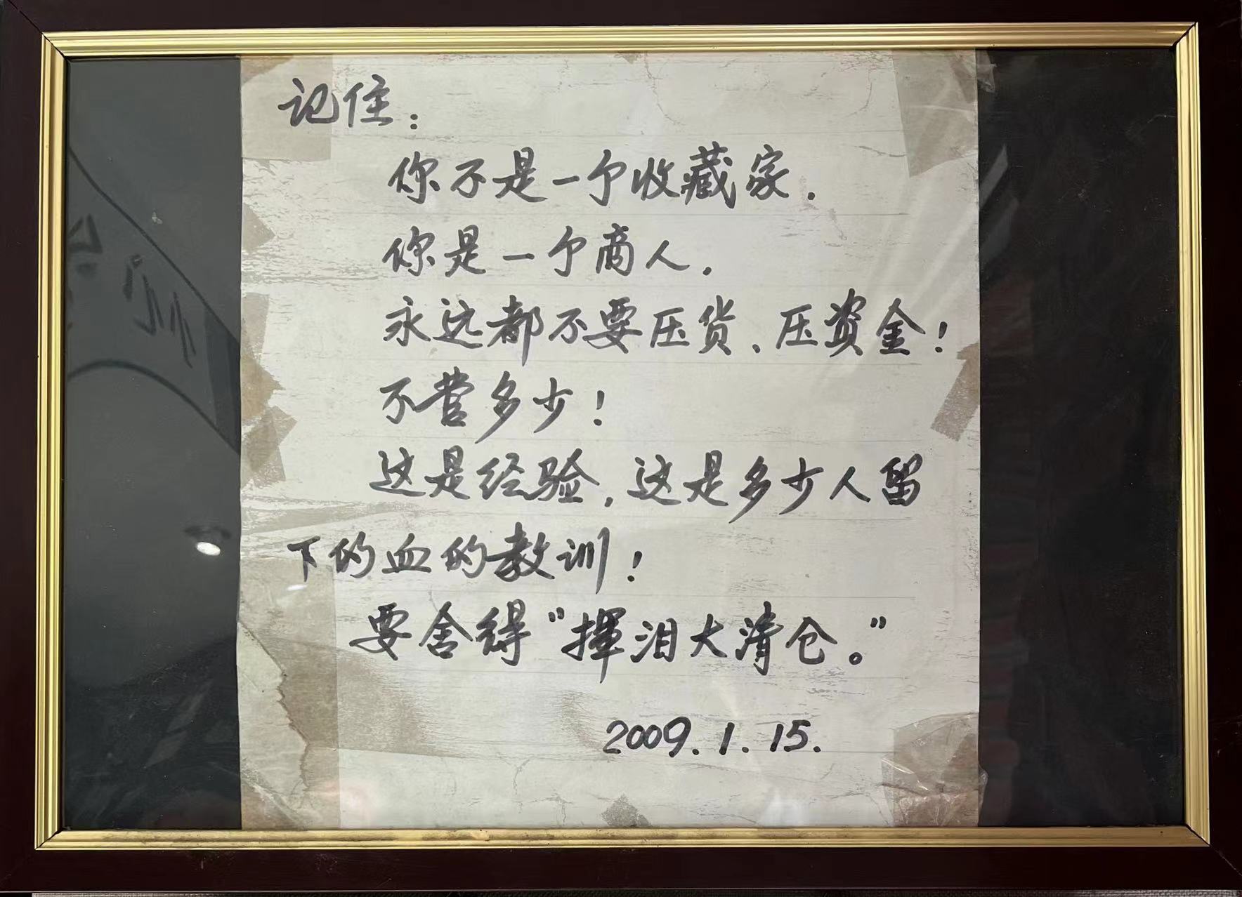 “记住:你不是一个收藏家,你是一个商人。永远都不要压货、压资金!不管多少!这是经验,这是多少人留下的血的教训!要舍得‘挥泪大清仓’。”2009年1月15日,竺老伯写下这么一段话,挂在店内勉励警醒自己。