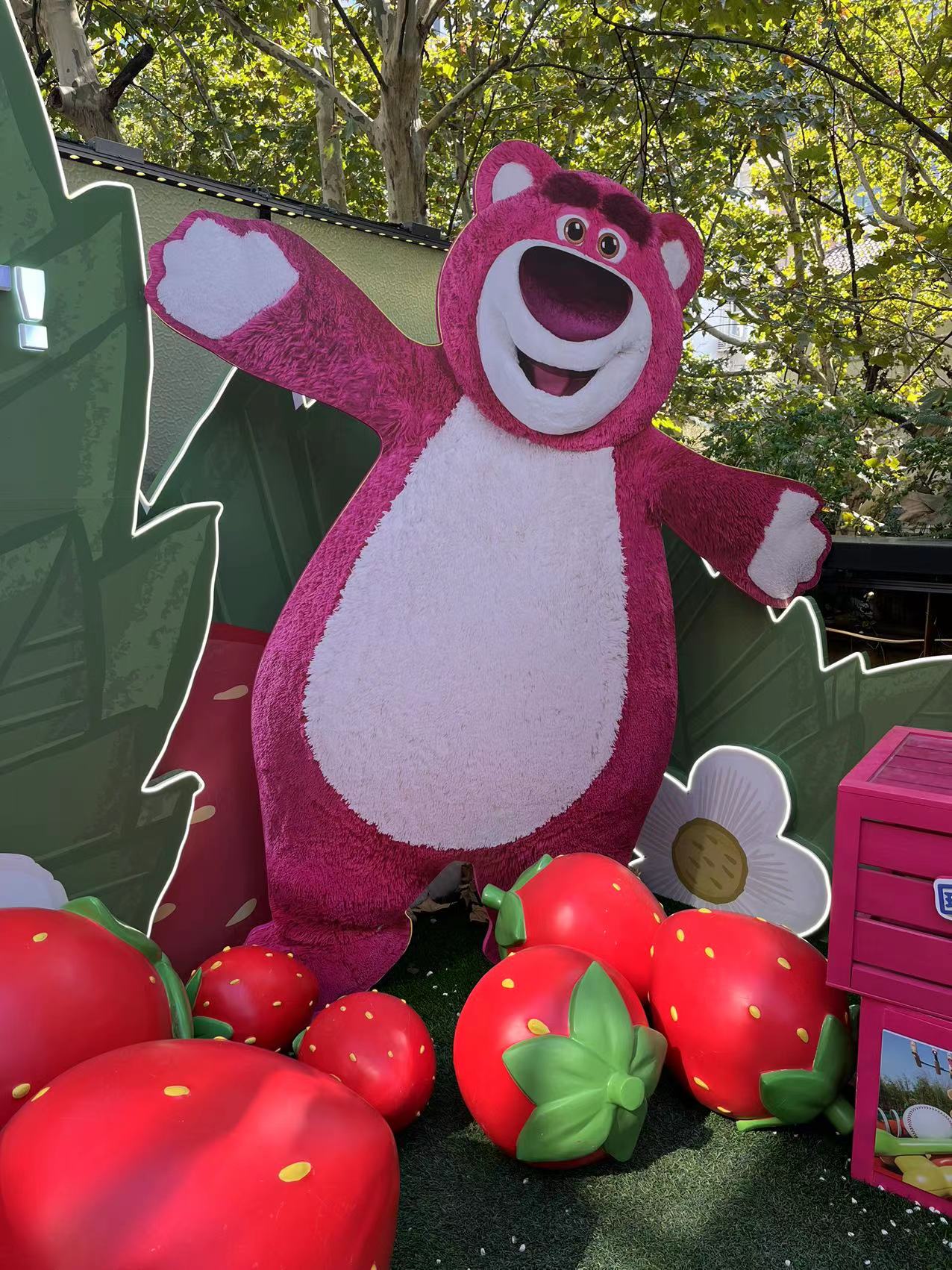 进门就有一只巨大的草莓熊和你打招呼,这只眉毛喜感、鼻头圆乎,走起路来又有憨憨之感的角色,瞬间将你拉入迪士尼的童话回忆。