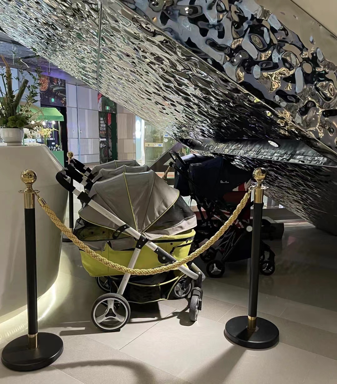 BFC南区商场的B2楼和1楼还设立了专属服务台,出借宠物车。据这里的工作人员介绍,商场内部采取“宠物不落地”原则。提供的推车内都配有牵引绳搭扣和尿垫,卫生和安全均有保障;宠物车的租借很简便,只需凭支付宝的蚂蚁信用积分或支付2000元押金。车子归还后,工作人员将清理垫子并予以消毒。