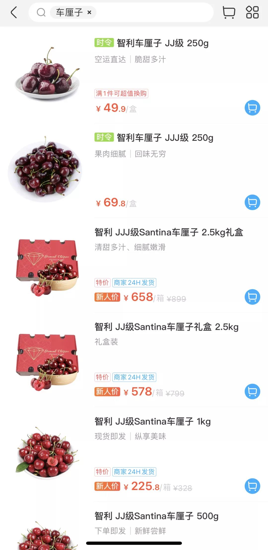 目前在盒马贩卖的车厘子,直径达到30-32mm的每250g售价为69.8元,个头稍小一些的,每250g售价为49.9元。