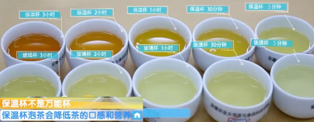 实验发现,茶叶在保温杯里长时间的高温闷泡后,品质会明显下降,汤色黄变、香气熟闷、苦涩度也有显著上升。茶汤中的活性物质,如维生素C、黄酮醇类也有所减少。不仅是绿茶,其他的茶类也不建议用保温杯冲泡。