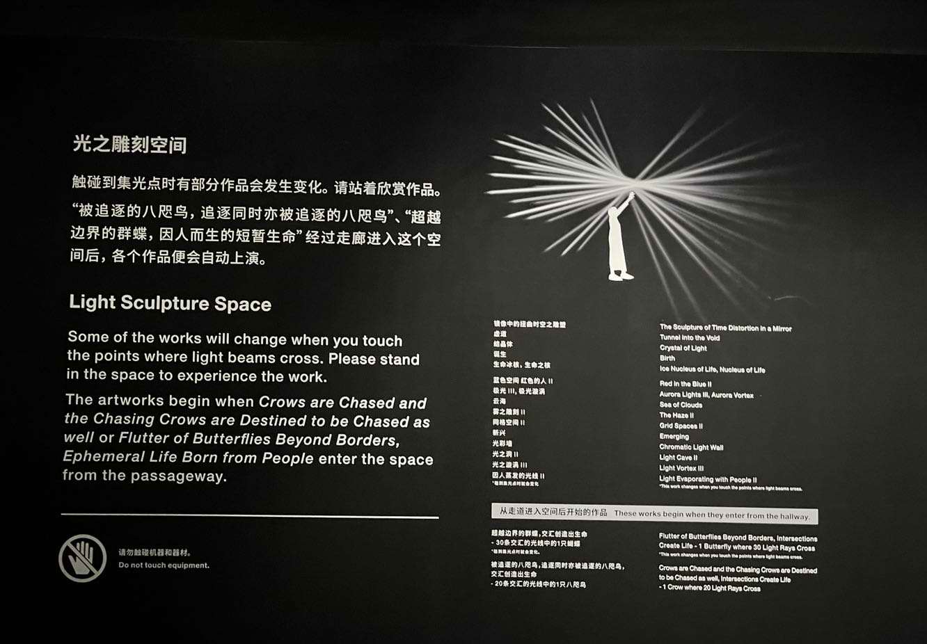伴随着或是激昂或是舒缓的音乐,光线不断变换、集合,将空间建构成立体事物。在十几分钟的时间里,这里会循环展示诞生、结晶体、虚道、生命冰核、极光漩涡、云海等等许多许多由光线雕刻而成的作品。在此空间,笔者驻足了不短的时间,但是还是没有把所有变化都看一遍。