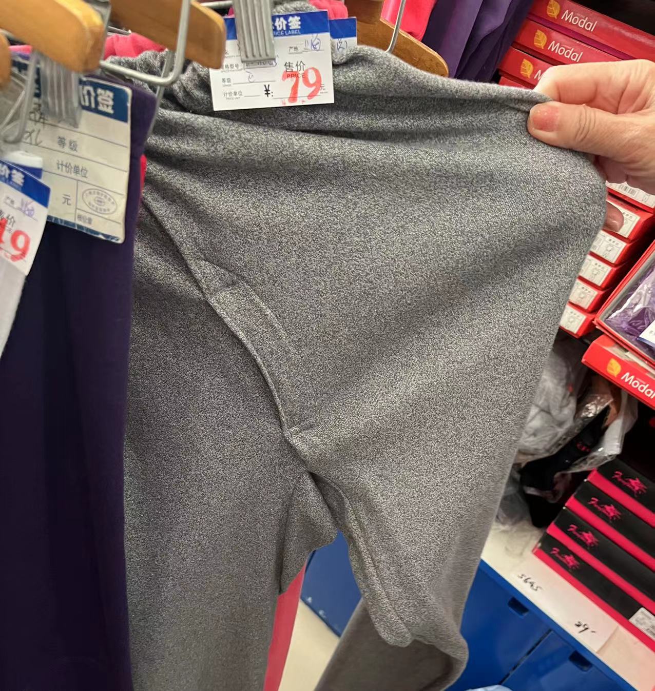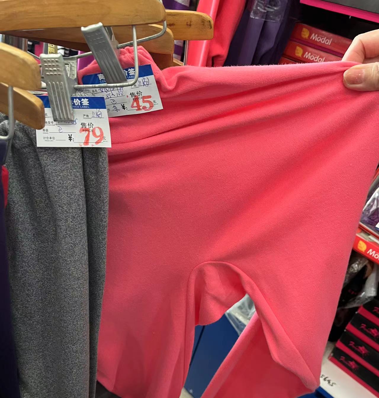 据了解,店内的招牌便是收银台前的一列货架上的“纯棉高腰、高裆”棉毛裤。薄的45元一条、厚的79元一条,老板表示,老年人穿惯了高腰高裆的棉毛裤,比较好扎衣服,保暖、舒适。