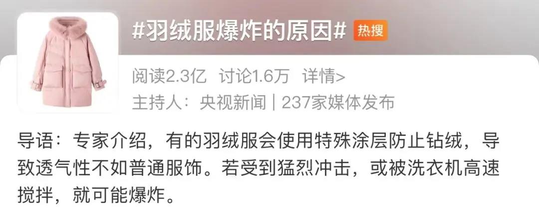 与此同时,一则#羽绒服爆炸的原因#也上了微博热搜榜单(不是巧了嘛),全国已有多地发生羽绒服爆炸。