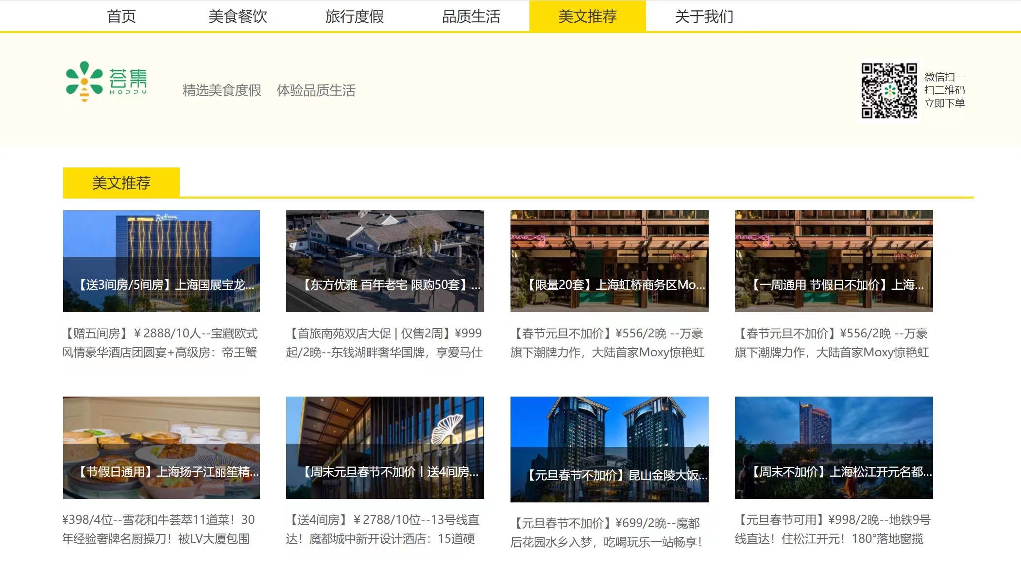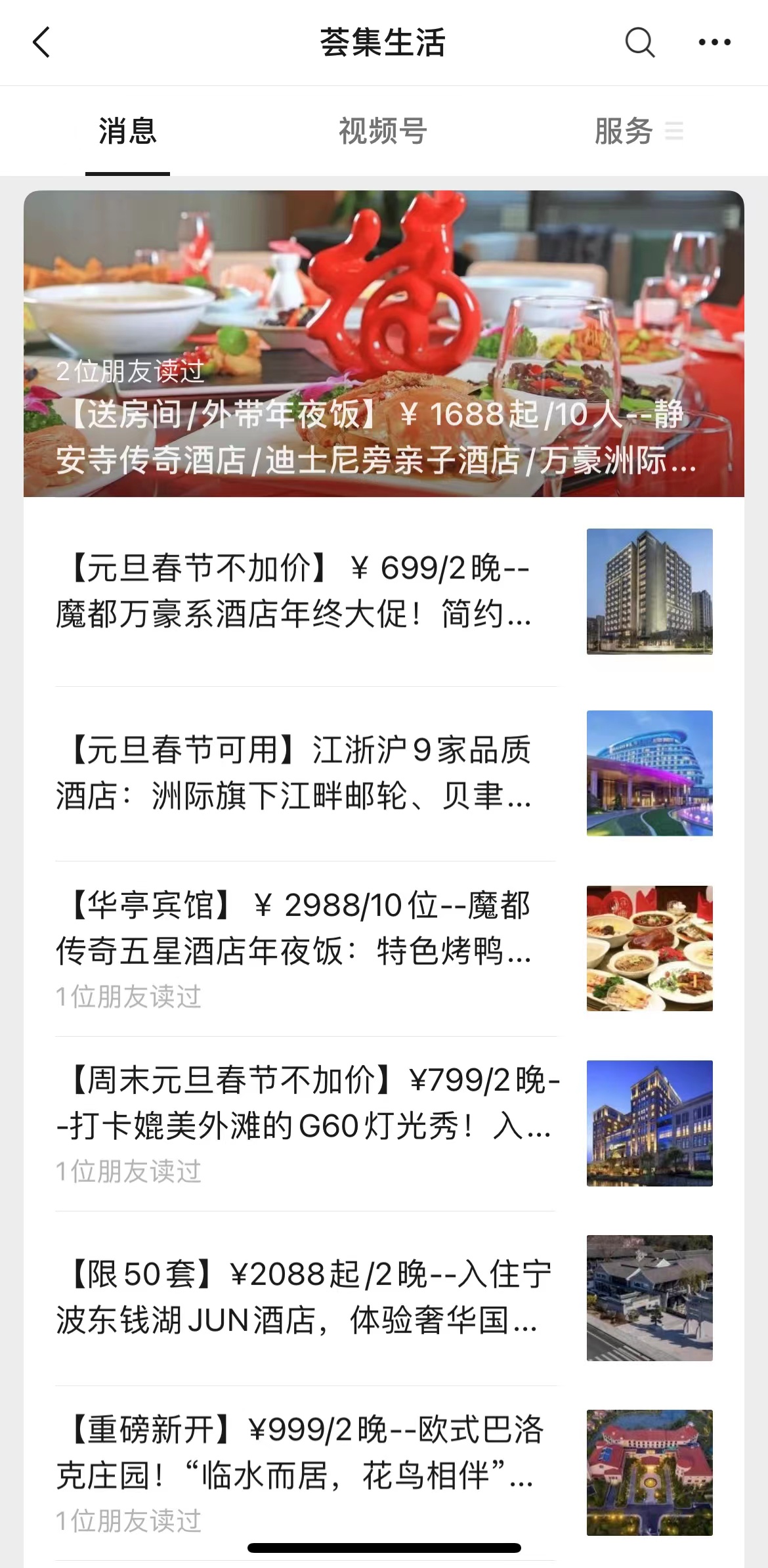 “顾客一般不知道哪个平台会第一时间推出此类优惠信息,基本都是朋友之间口口相传、电话预订。不知情的顾客看到消息,再通过美团或大众点评查找电话,就已经迟了”。一位酒店工作人员告诉笔者,“荟集”网会第一时间发布各大酒店的优惠套餐等信息,扫描二维码通过“荟集生活”公众号了解与预订,不论是上海还是周边城市的酒店,元旦、春节套餐通通一网打尽,让你及时获取最新信息。