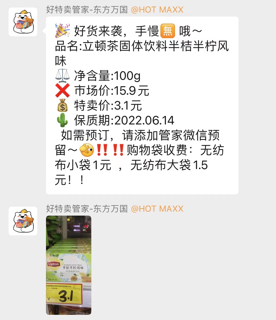 据营业员小李介绍,店铺的高峰期在中午12点到下午1点,还有晚上6点到8点,这两个时间段刚好是园区职工中午休息和晚上下班的时间。在收银台旁边,贴着四个群二维码,群里每天会定时发布最新上架的商品,有需要的可以在群里预定。我加入了一个群,不一会儿就收到了店员发在群里的消息,每一样商品的保质期信息都有,一瓶星巴克咖啡饮料的特卖价是6.5元,一盒立顿红茶的特卖价3.1元。