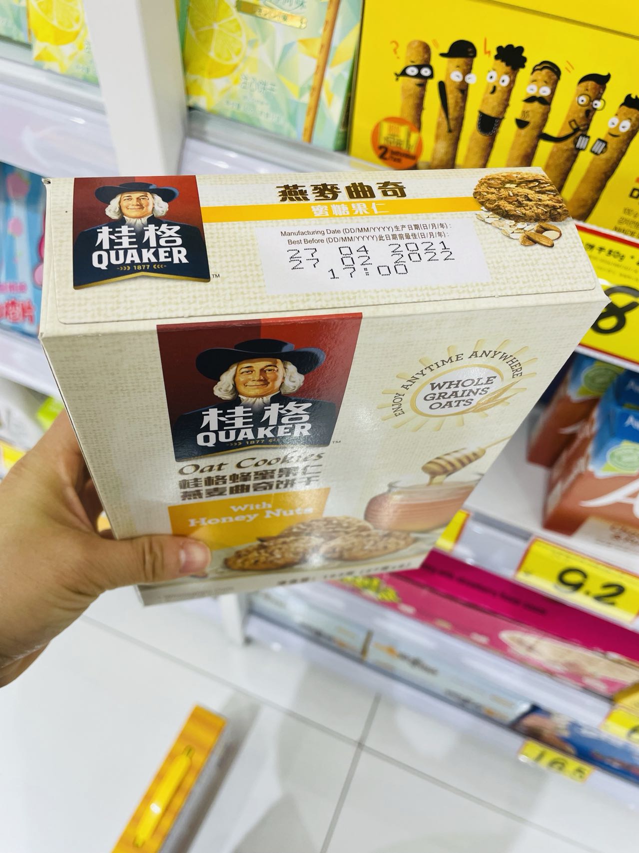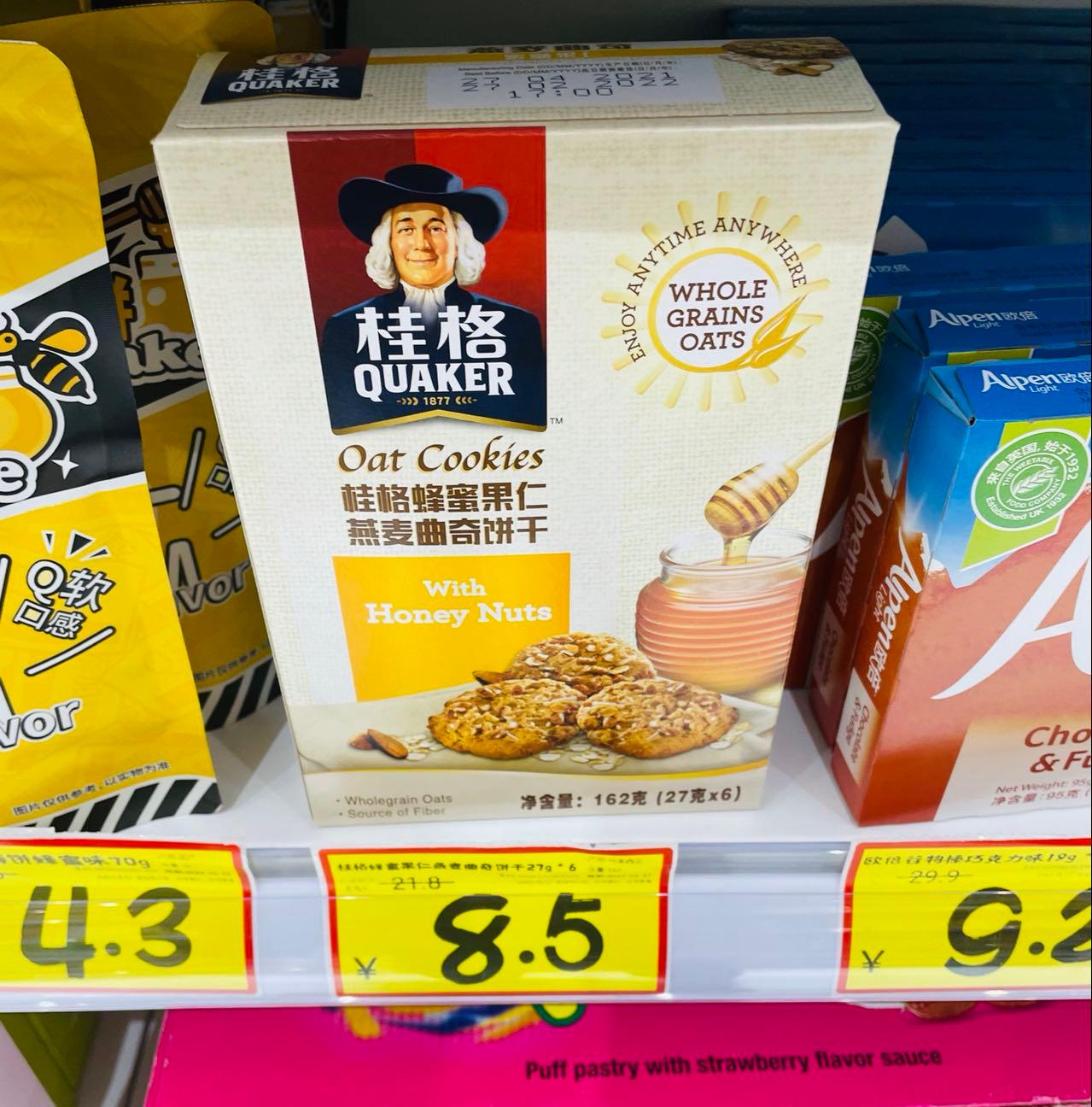 笔者在店里看了下,虽然主打临期商品特卖,但其实大多数商品的保质期至少在半年以上,有个别商品效期较短,比如有一款桂格燕麦曲奇,保质期是到2022年2月27日,价格为8.5元一盒。