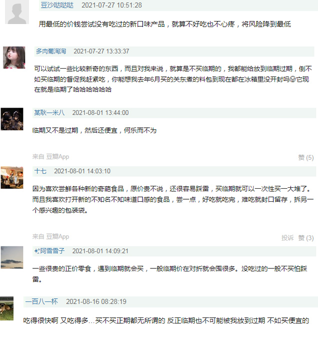 有不少网友分享自己买临期食品是为了低价尝新,避免踩雷。