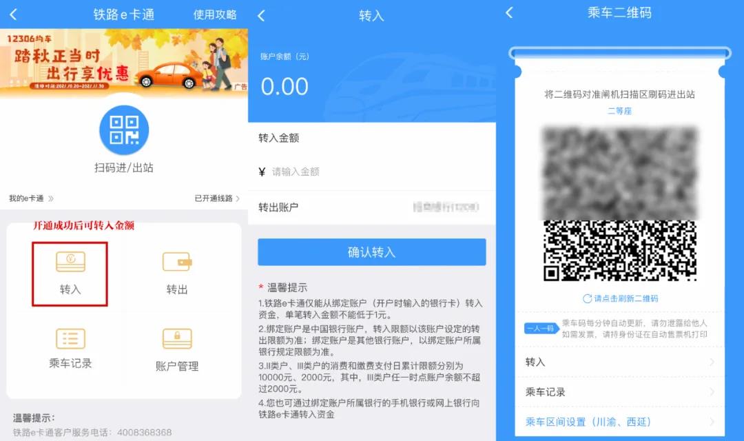 开通成功后即可转入金额、扫码进站。需要注意的是,持“铁路e卡通”进站时,账户内余额不得少于150元,账户内余额不足时不能扫码进站。