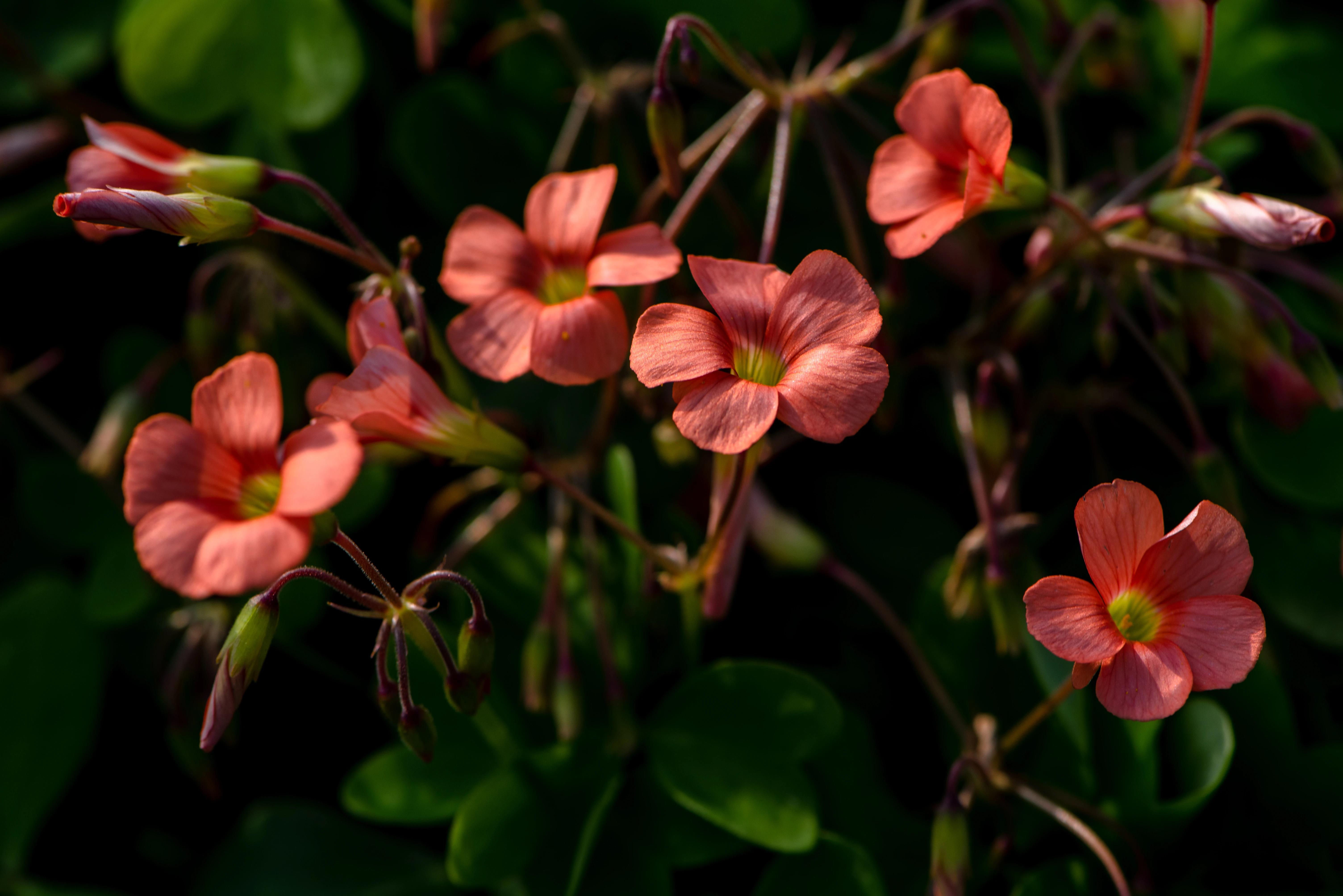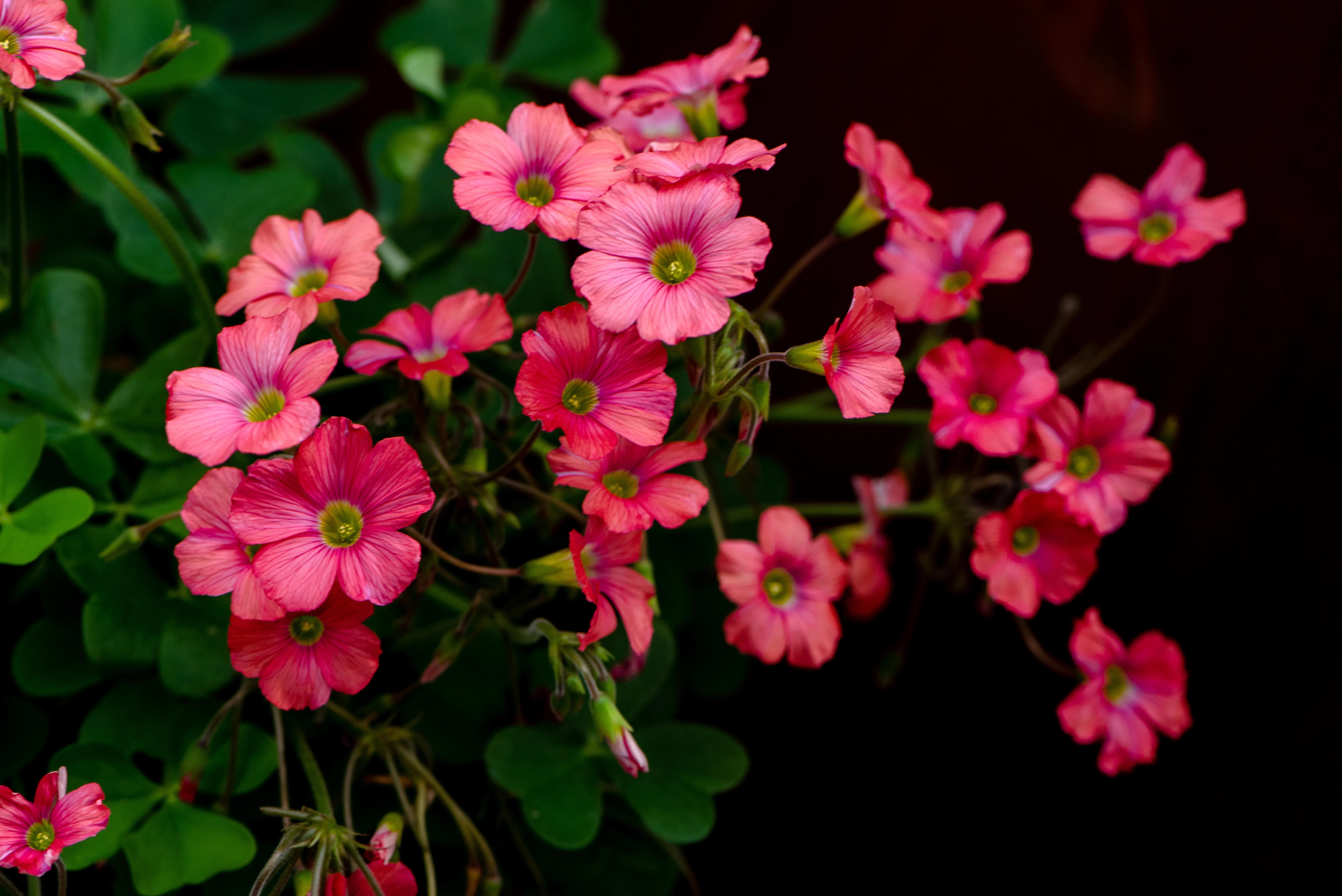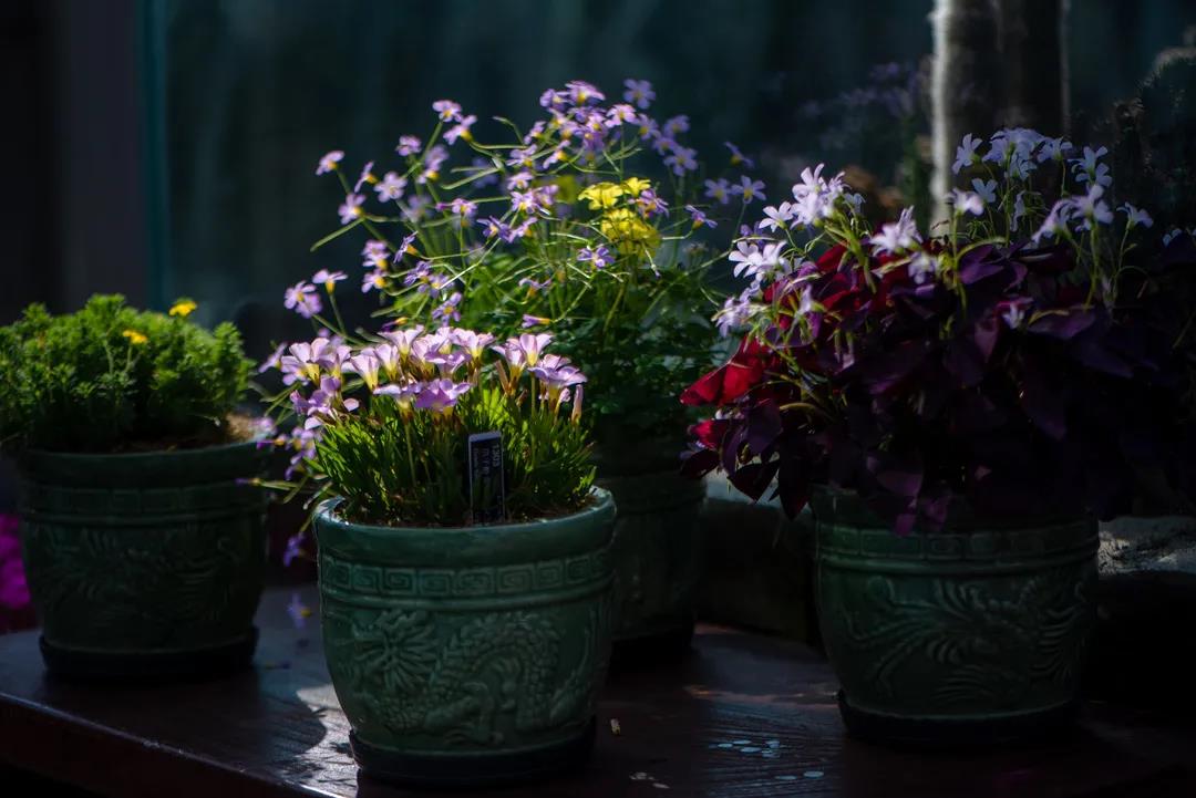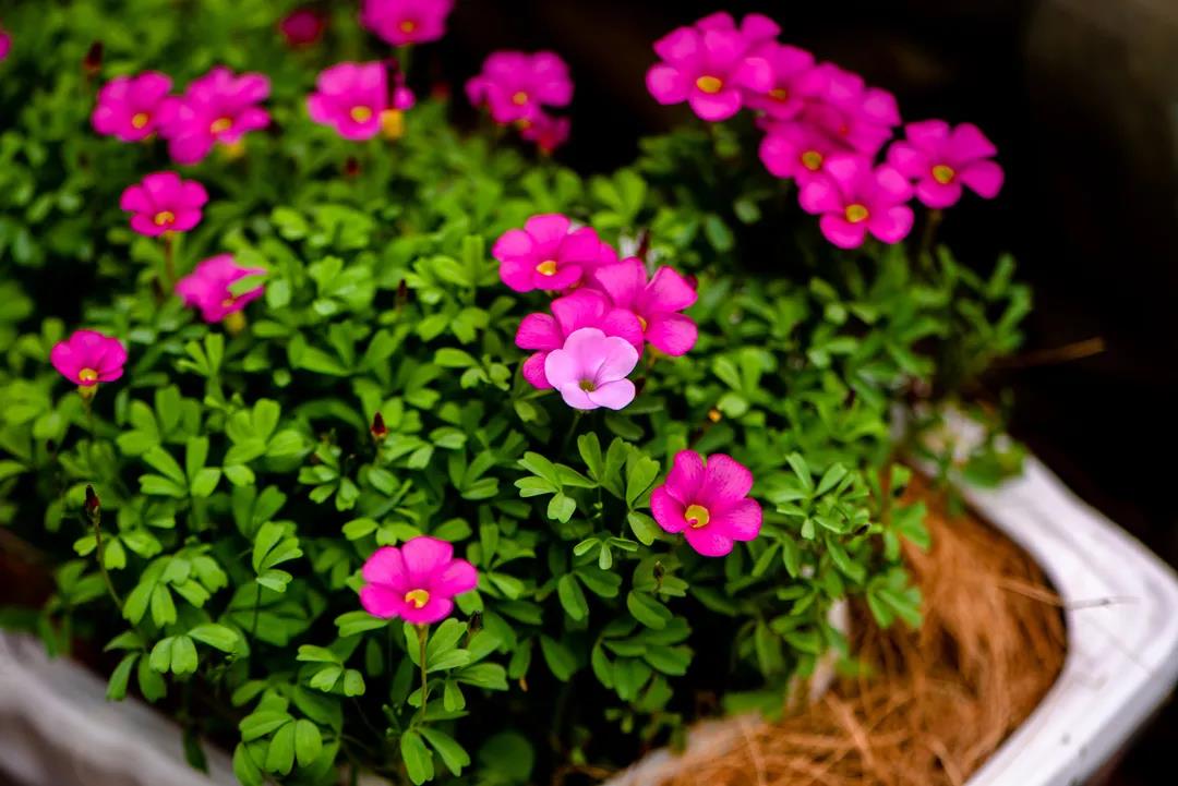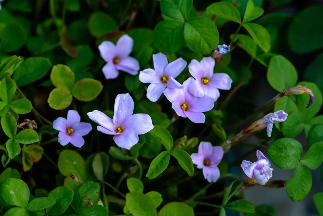 紫蓝色系的酢浆草花朵,躲藏在茂密的绿叶中,它们时而簇拥,时而分散,一朵朵紫红色的小花美丽动人,让人心生欢喜。