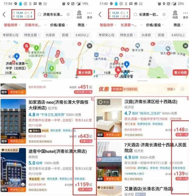 查询发现,在订房的软件上,济南市长清第一中学附近的酒店平时价格大约在100到150元,而据考生介绍,在23日和24日,也就是今年研究生考试期间,千元已成为普遍的房价。