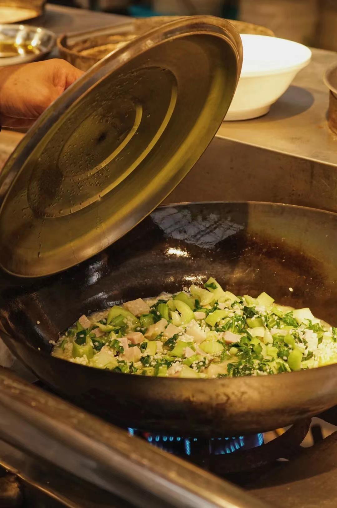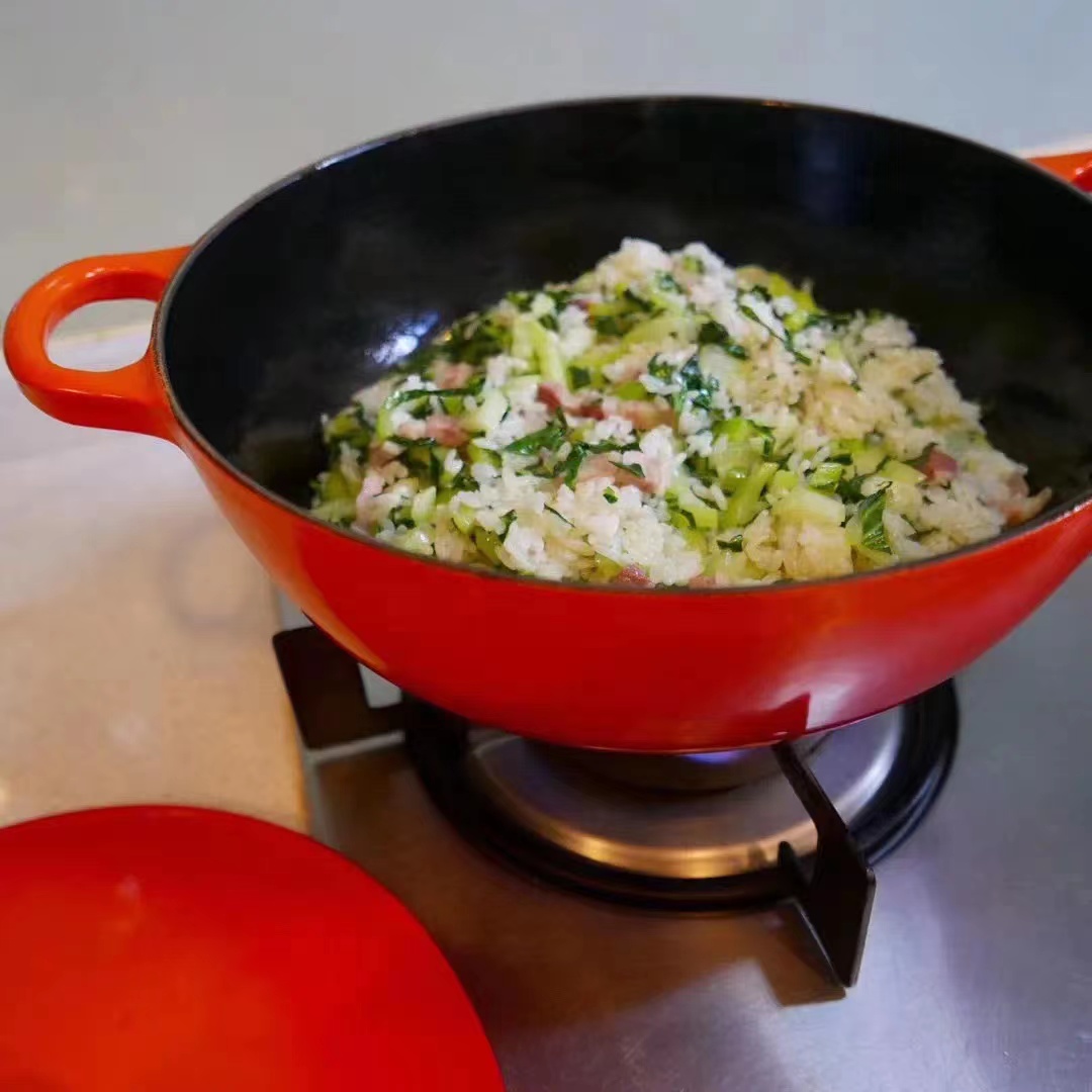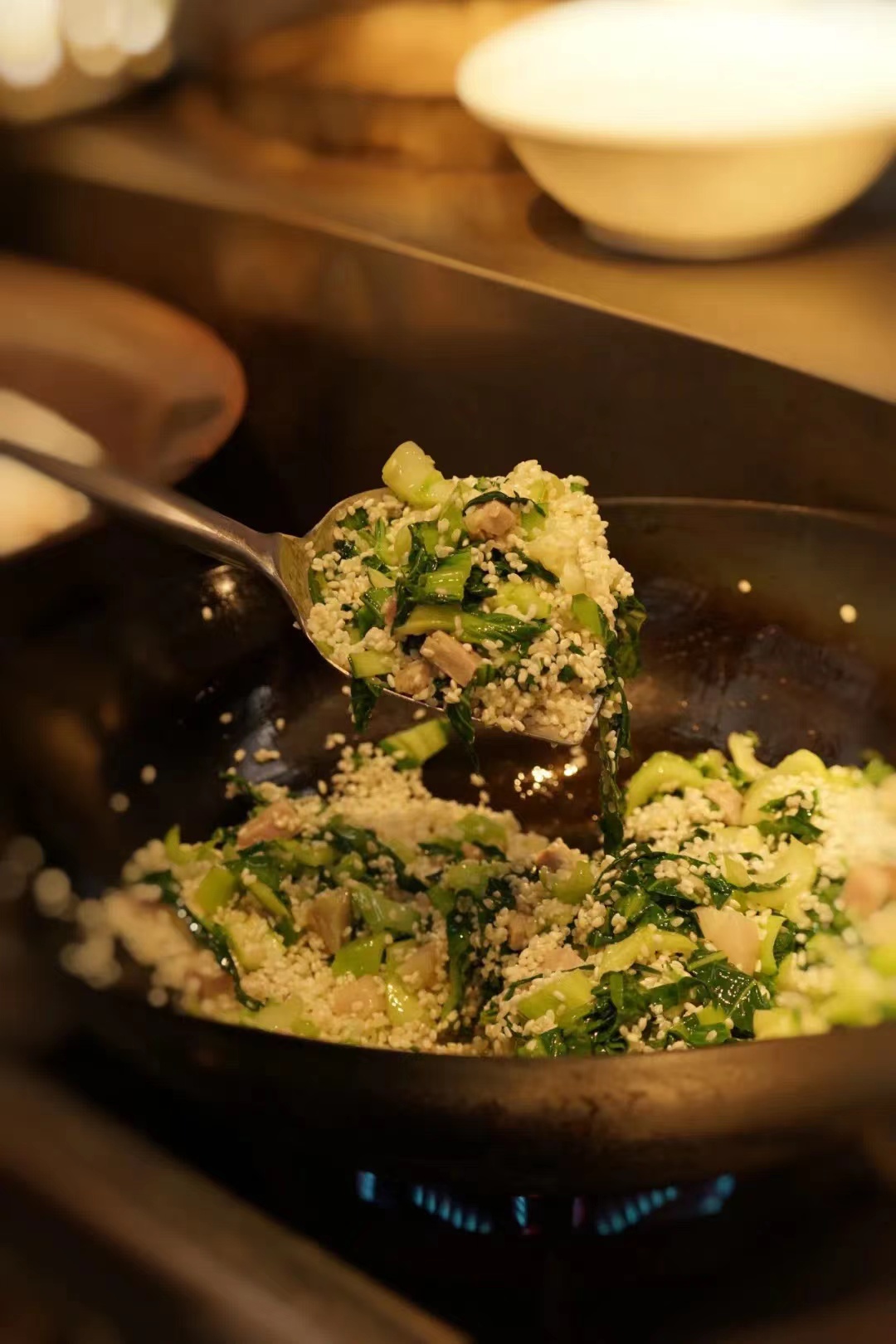 传统的菜饭就是在灶火台上做的,现在也很难看到了,自家熬制的猪油下锅,放入自家腌制咸肉,用园子里新鲜采摘的青菜炒制,最后倒入米焖煮半小时,就可以出锅了。