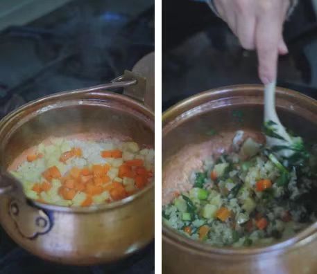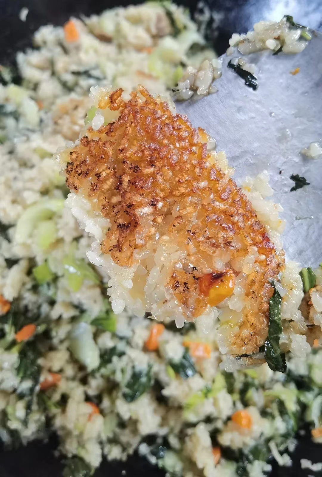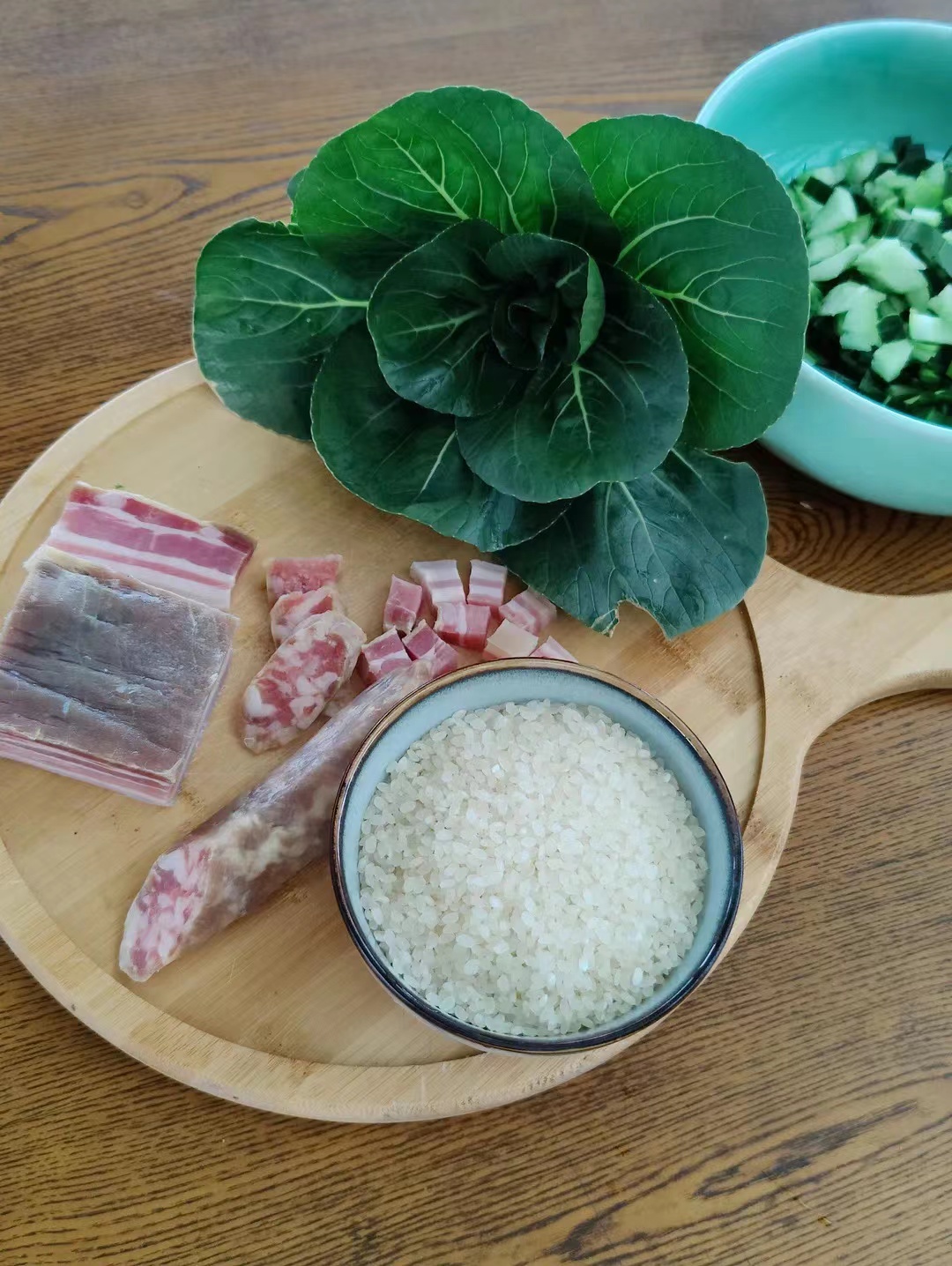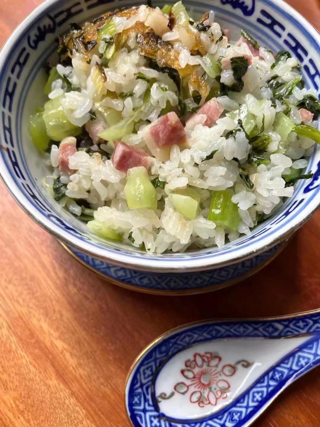 传统的菜饭就是在灶火台上做的,现在也很难看到了,自家熬制的猪油下锅,放入自家腌制咸肉,用园子里新鲜采摘的青菜炒制,最后倒入米焖煮半小时,就可以出锅了。