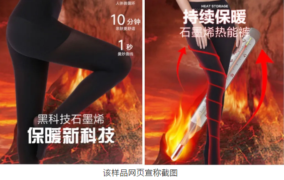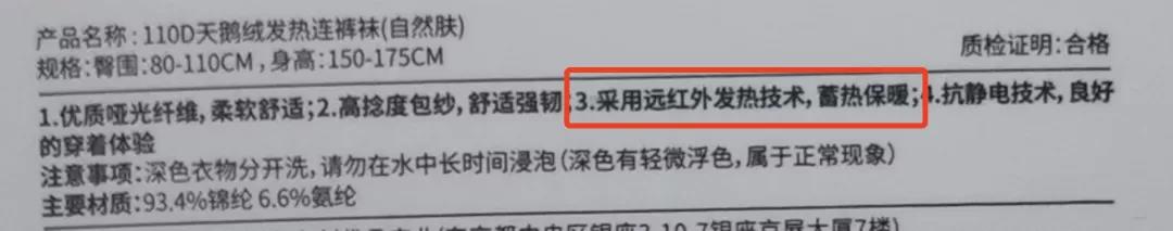 又如标称由苏州易胜华鑫信息技术有限公司生产的110D天鹅绒发热连裤袜(自然肤)(标称商标:MINISO ),其包装标注“采用远红外发热技术,蓄热保暖”,但经检测保温率仅21%。