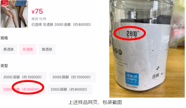 如从抖音平台的“浪莎服饰内衣旗舰店”购买的样品,其网页宣称旦数为“8000D”、标称由浙江梦娜袜业股份有限公司生产销售的富宽臀裤(标称商标:MengNa梦娜,标称货号:G4565),其产品包装标称“2800+DEN”。