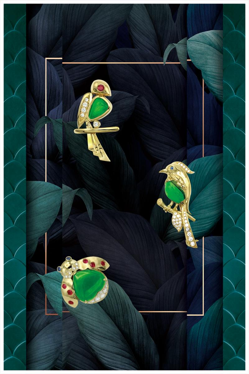 红、蓝、绿宝石的选用使瓢虫具有了蓝宝石的眼睛、圆润晶莹的绿色翡翠身体,镶嵌红宝石的金色外壳张翅欲飞,“宝石瓢虫”栩栩如生;而分别具有红蓝宝石眼睛、绿色翡翠身体的小鸟停驻在金色的树枝上,也十分生动别致。老凤祥设计师把自然界中这些鸟虫的生动、美好,通过翡翠、红蓝宝石、钻石等材质巧妙运用,打造出珠宝首饰,“飞”上了都市女性的衣饰上,十分精致有情趣。