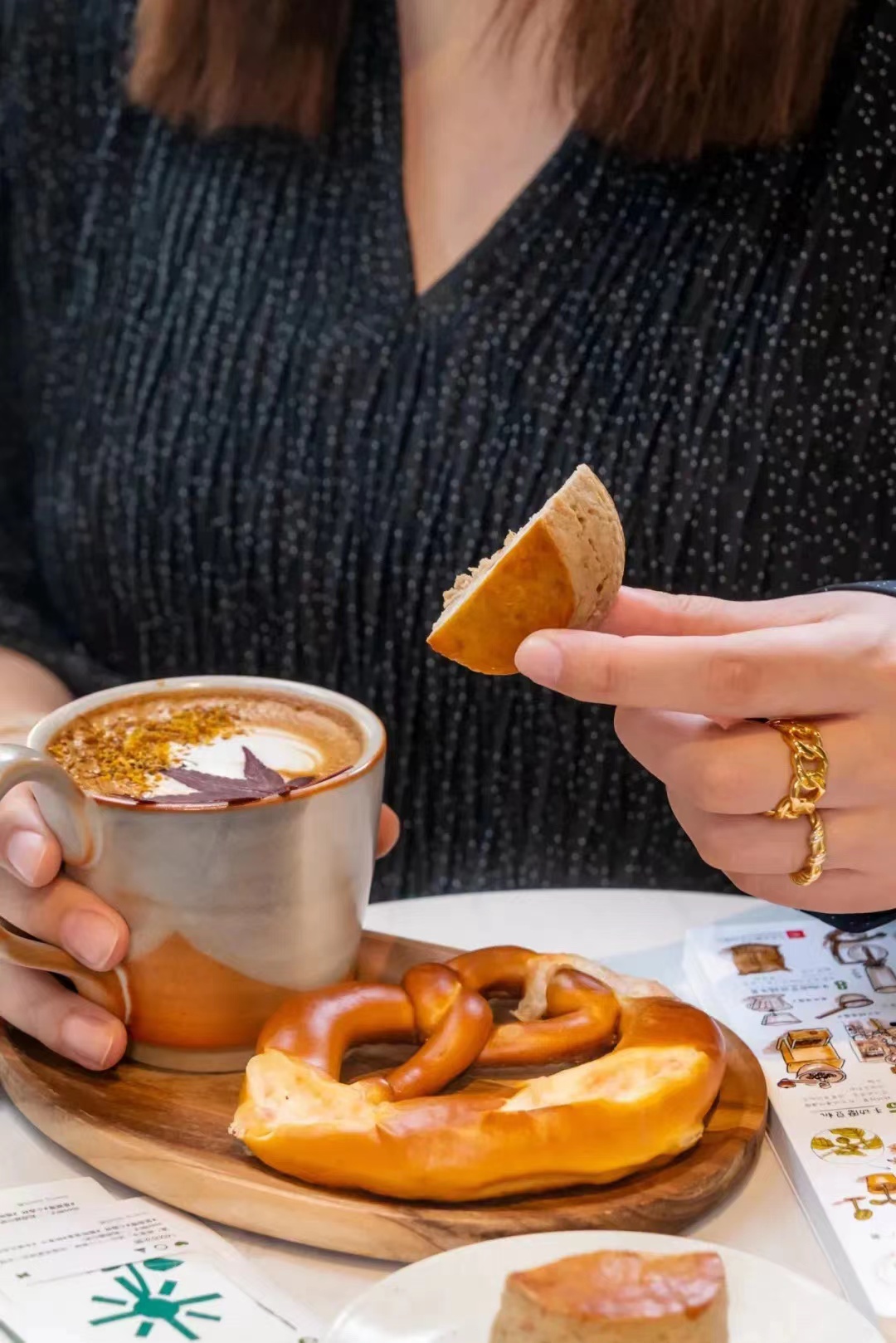 坐在奶油色系的Phi coffee,吃一份健康的cp套餐,看会落叶和过往的行人,很治愈了!再来一份植物火腿德国碱水结,口感超松软还带着植物清香,简直是直击灵魂深处的享受!