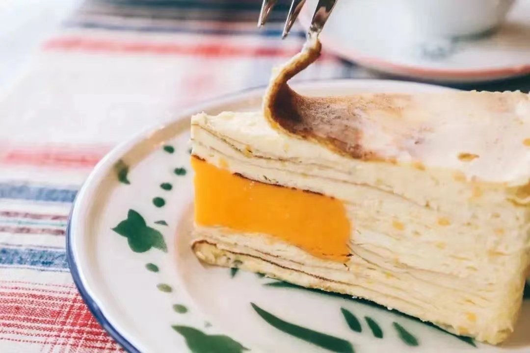 店里虽然招牌是咸蛋黄千层,但牛角可颂也圈粉了很多人。用碱水面团做出来的羊角,外表酥脆,回弹性好,每一口都很有嚼劲。