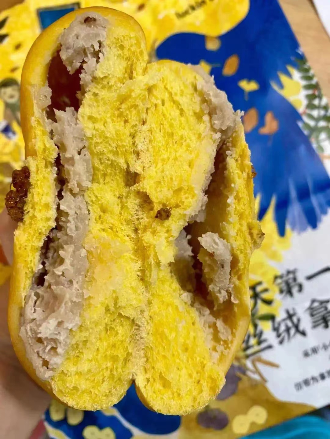 瑞幸咖啡的金桂芋泥软欧包,用的是桂林干桂花+广西荔浦芋泥,送到手上时还是冰的。面包体松软绵密,有南瓜味,里面满满的芋泥馅料,略带颗粒感。