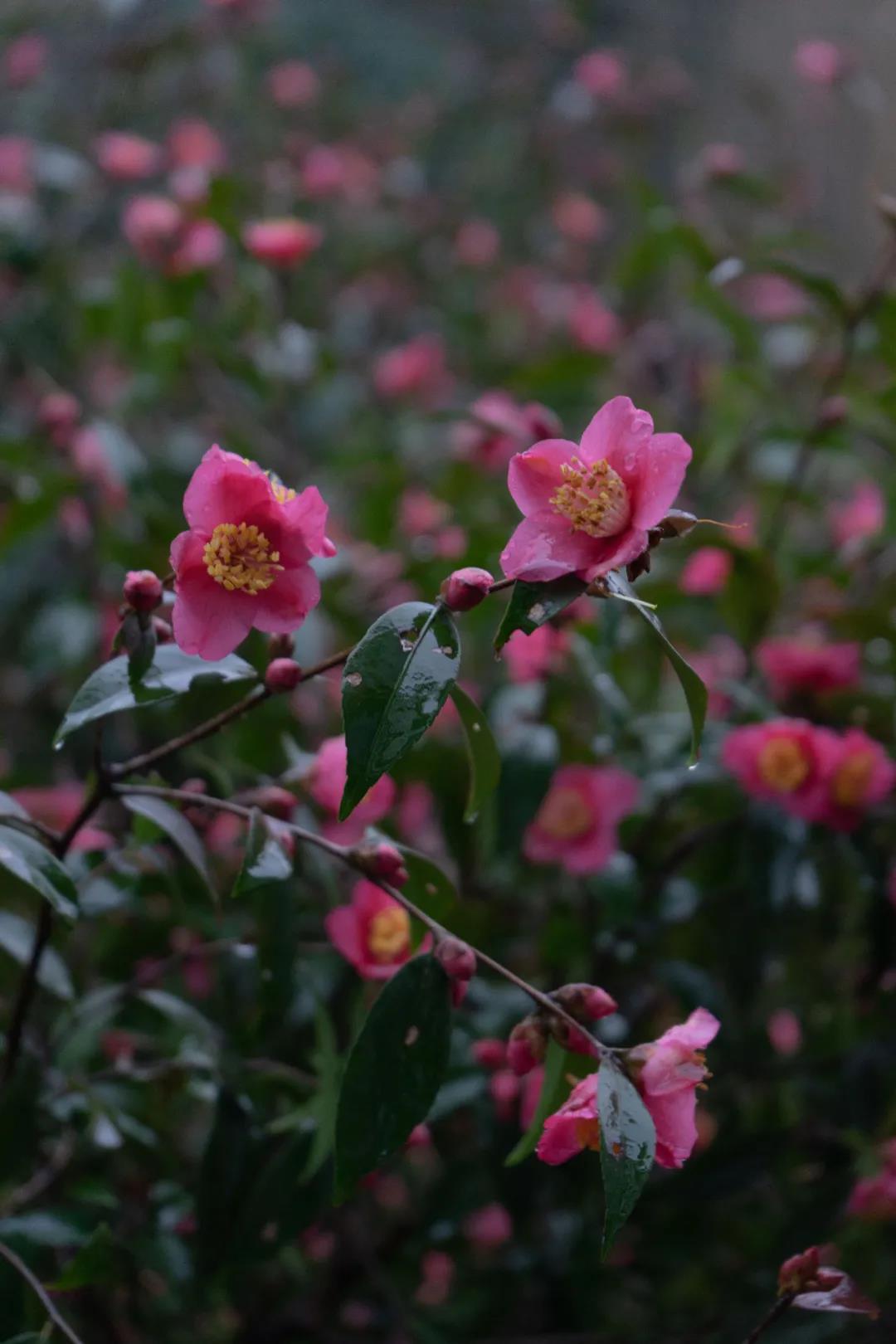 山茶又名山茶花,是山茶科、山茶属下种和品种的通称。花瓣为碗形,分单瓣或重瓣,单瓣茶花多属原始花种。茶花的品种极多,是中国传统的观赏花卉,亦是世界名贵花木之一。“似有浓妆出绛纱,行充一道映朝霞。飘香送艳春多少,犹见真红耐久花。”写出了山茶花的娇艳欲滴与生机勃勃。