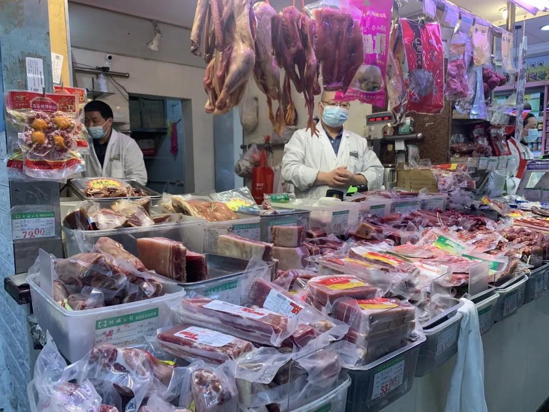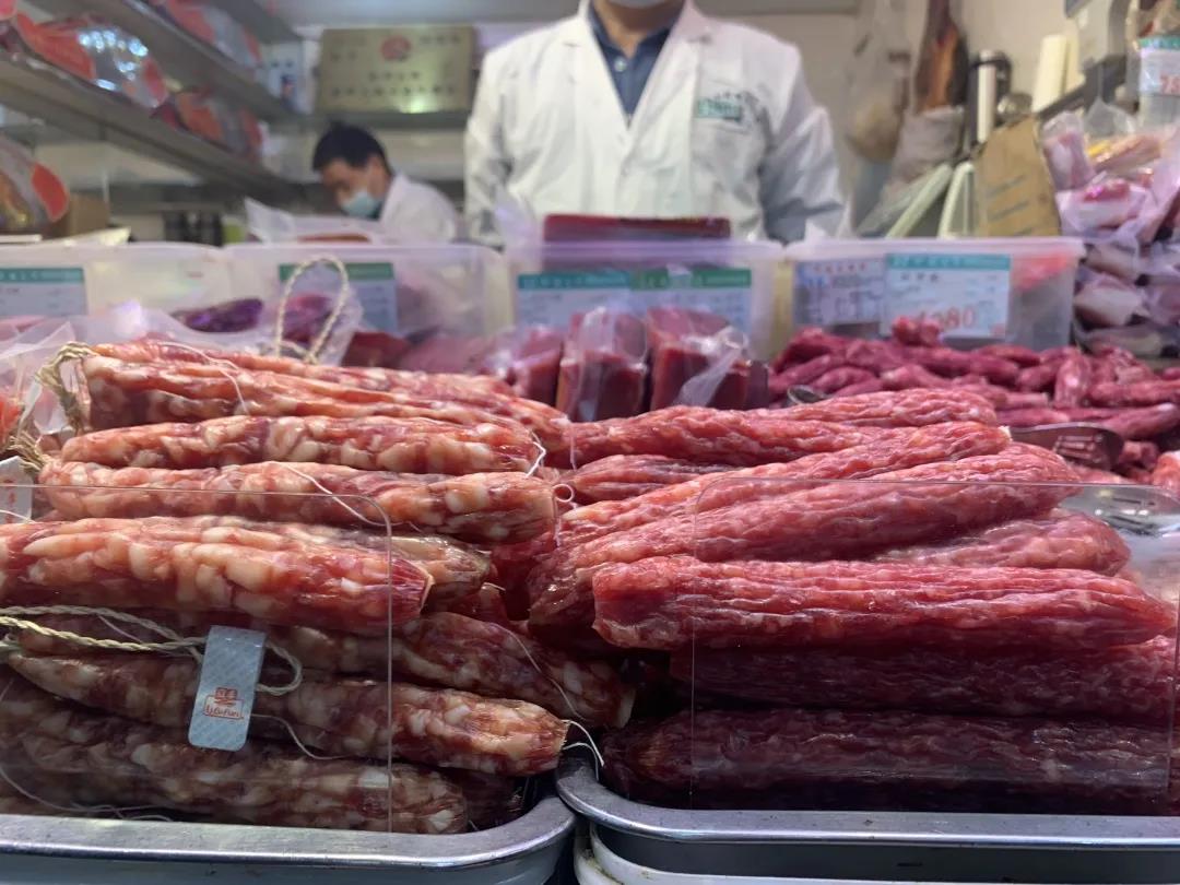 油亮咸香的风鸡、风鸭、风鹅,被串起来吊着,年味十足;抹了盐巴的大块咸肉、浓油赤酱的酱油肉、红白相间的香肠腊肠,在柜台上摆得满满的。
