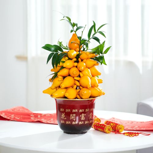年桔又名金桔,果实色泽金黄,黄澄澄地正如金锭子般高挂枝头,漂亮又讨口彩,是赏果不赏花的独特盆景。它意味着来年硕果累累、招财进宝、步步高升,大吉大利,吉祥如意!