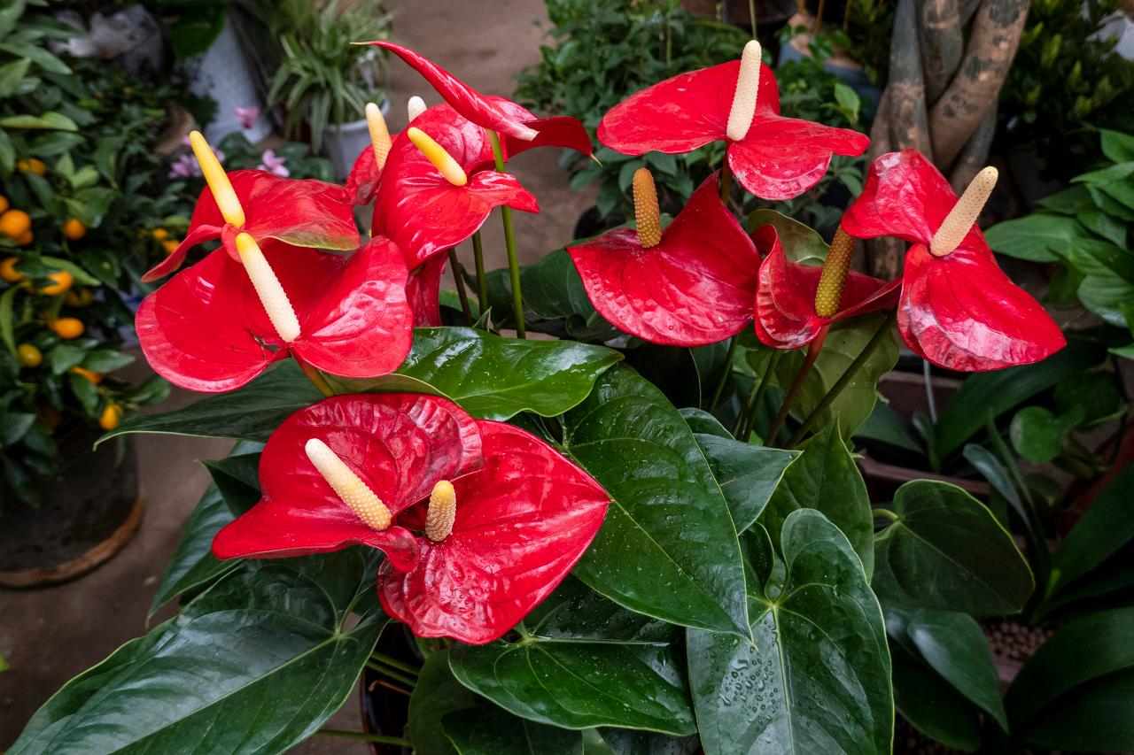 红掌又名花烛,四季常绿,色彩丰富,花期较长,是过年必买的年宵花卉之一,花期特别长,养好了全年都能够开花。花朵红艳似火,叶片油绿宽大,观赏价值很高,摆放在客厅,优雅又美丽。
