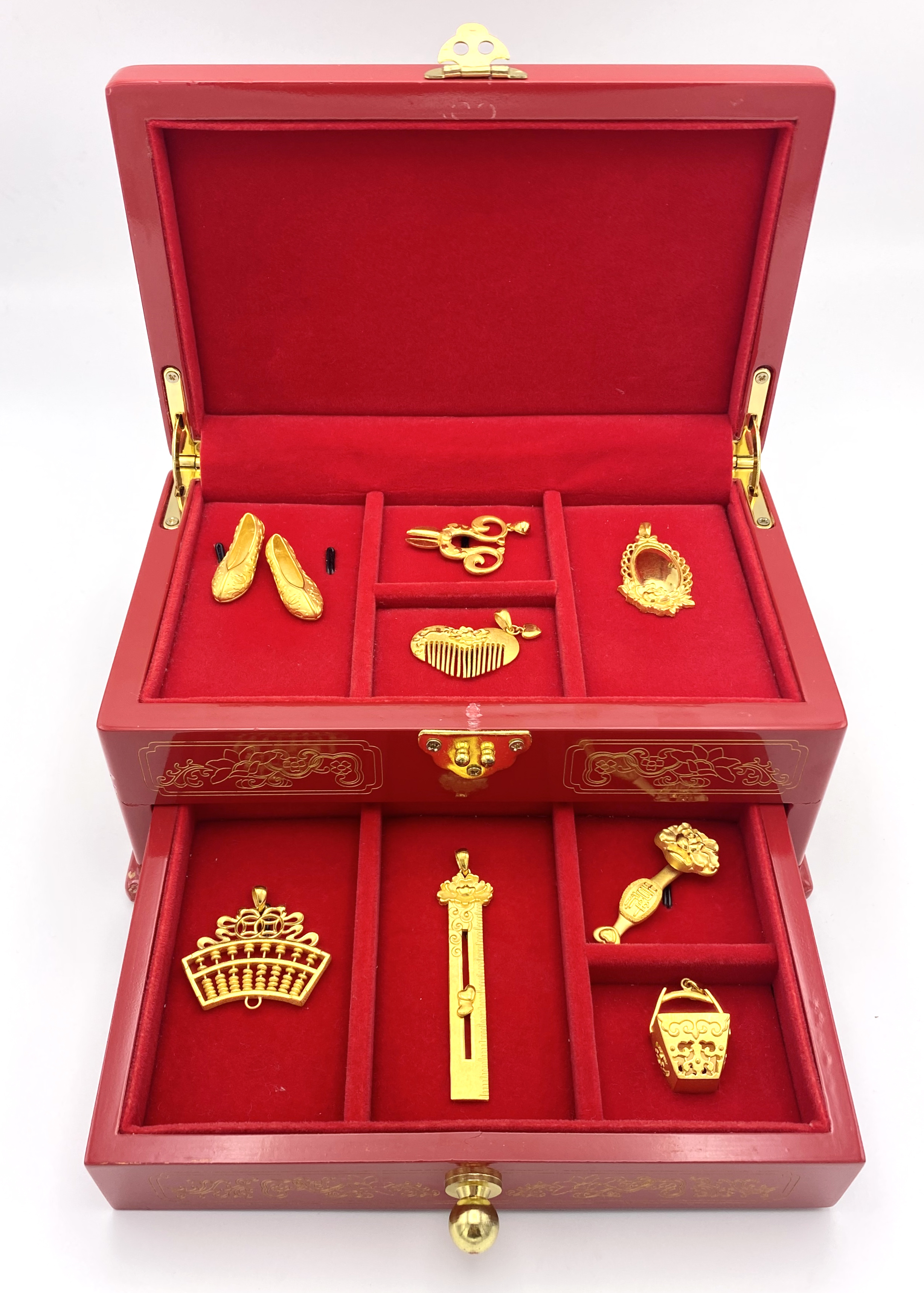 【黄金婚庆九宝系列】有尺子、镜子、剪刀、算盘、绣花鞋、如意秤、都斗以及压钱箱九种小配件,取 “天长地久”之意,造型雅致精美,可佩戴、摆设珍藏两用。整个系列不仅高雅、含蓄,同时也彰显了婚嫁首饰厚重的文化底蕴,很有收藏意义,摆在新房也特别讨喜。