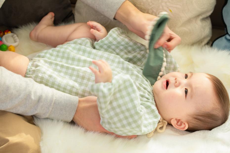 定期检查。每次给宝宝穿衣服时检查钮扣等附件是否松动或散线,确保钉牢后再给婴幼儿穿戴,以免误吞。