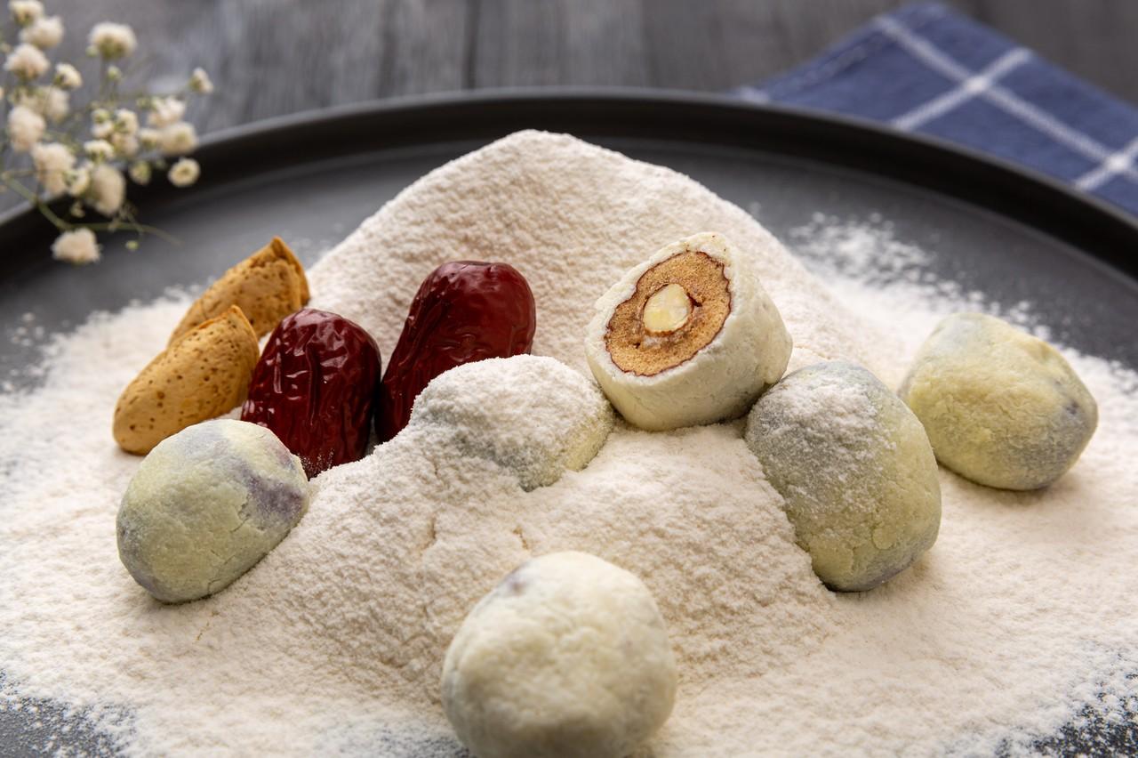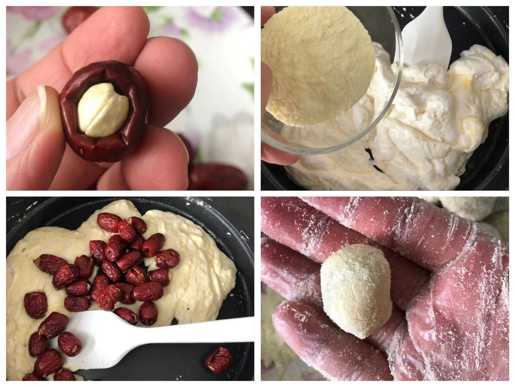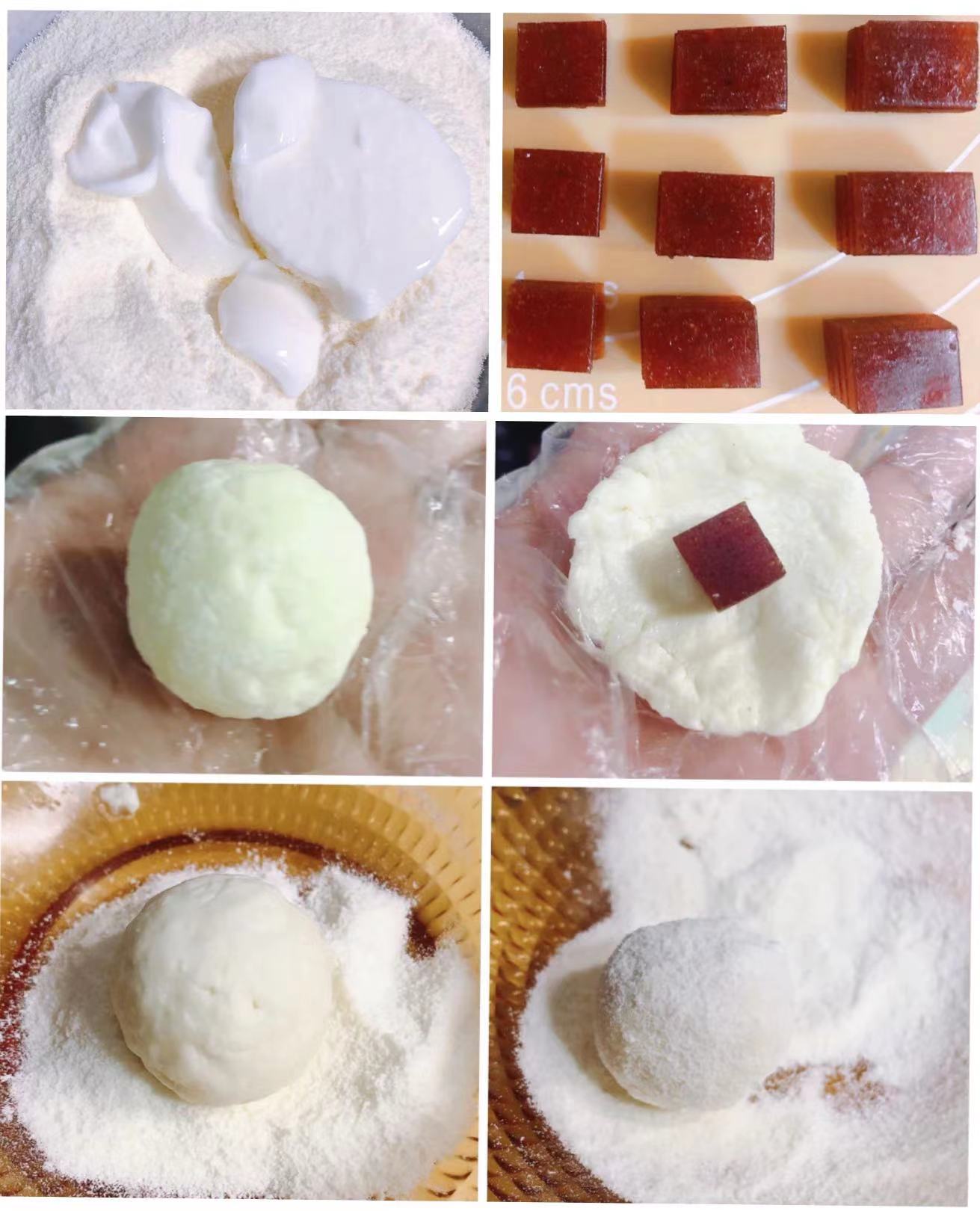 4、小剂子捏扁,包上山楂糕丁,收口搓圆,滚上一层奶粉即可。