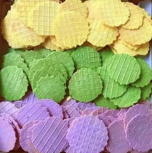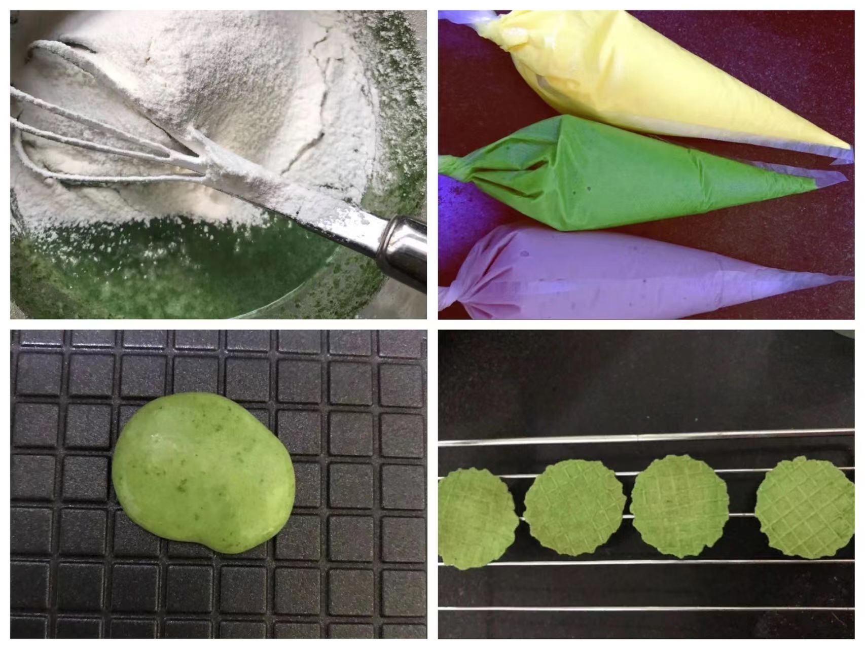 3、面糊装入裱花袋,蛋卷机热以后在上面挤一元硬币大小的面糊;