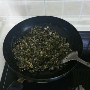 2、冬菜稍微切细,热锅倒入适量的油,下入调料3的姜、蒜末炒香,再下入冬菜炒匀炒香,备用