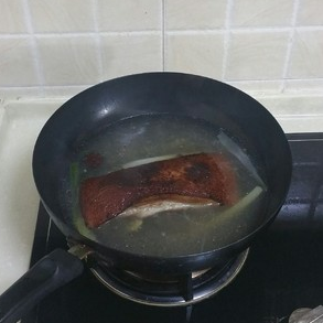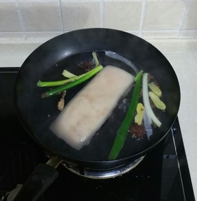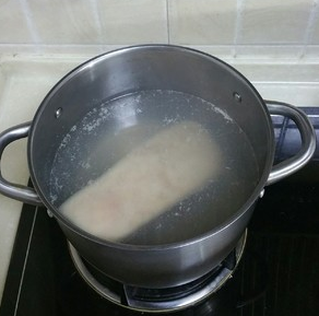 7、再放回煮过肉的锅中,小火煮五分钟,让肉皮变软并起皱,捞出晾凉,切成20到24的厚片