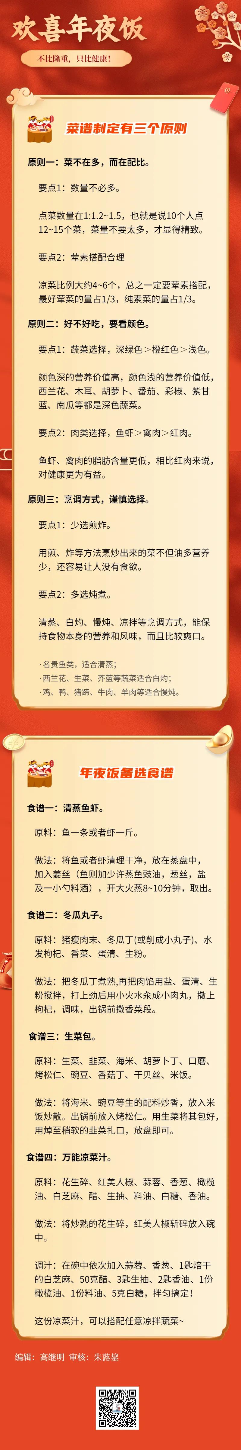 摘要: 年夜饭菜谱三个原则:菜不在多,荤素搭配纯素菜占三分之一;蔬菜颜色以深绿色、红色为主;烹饪方式,少煎炸多炖煮。