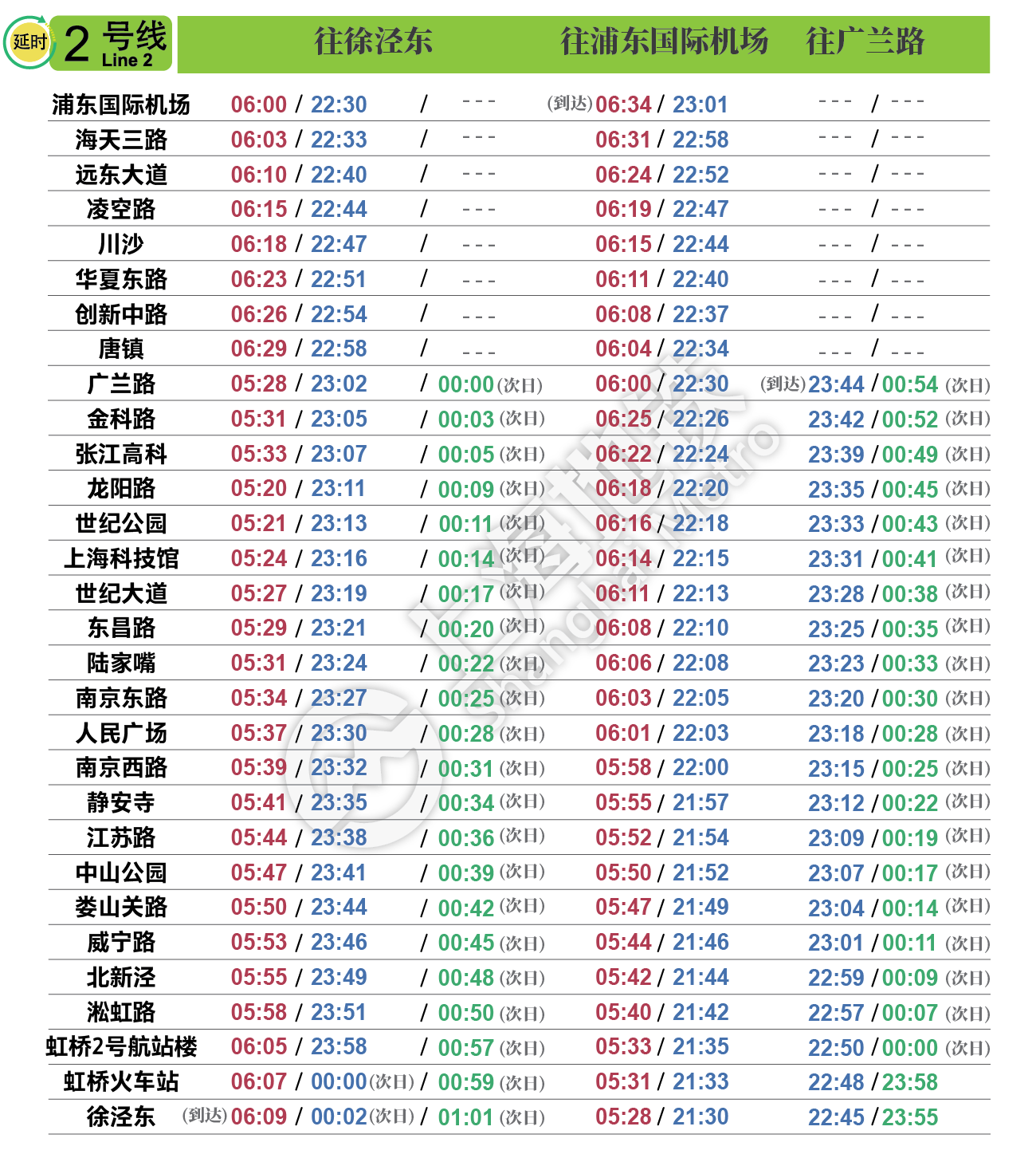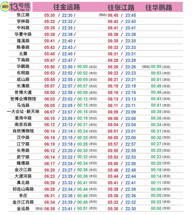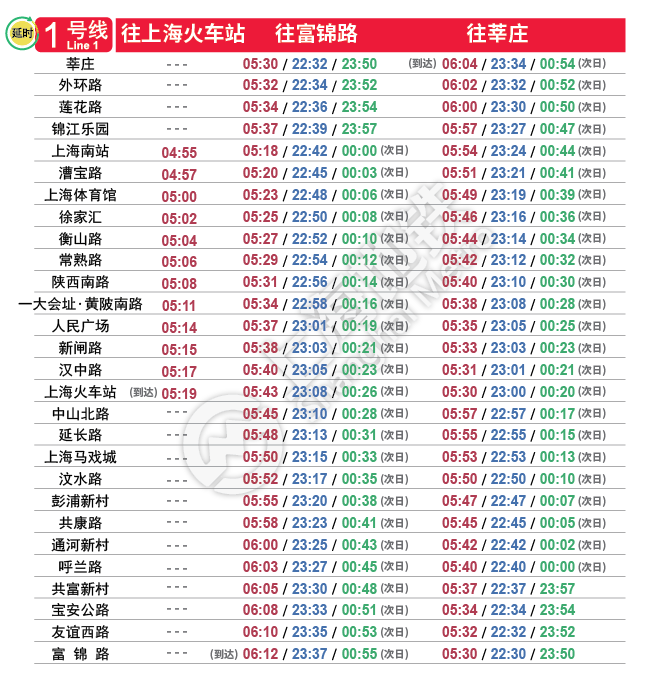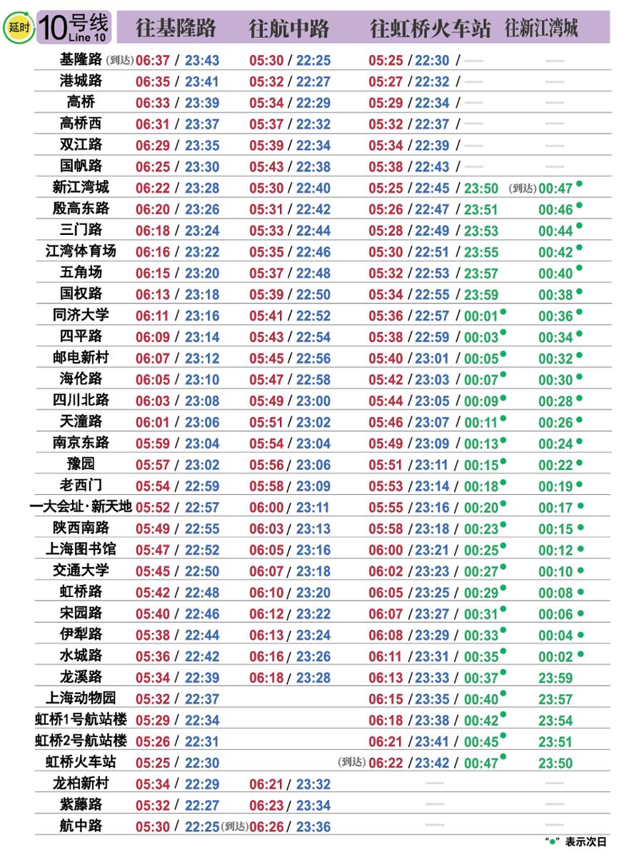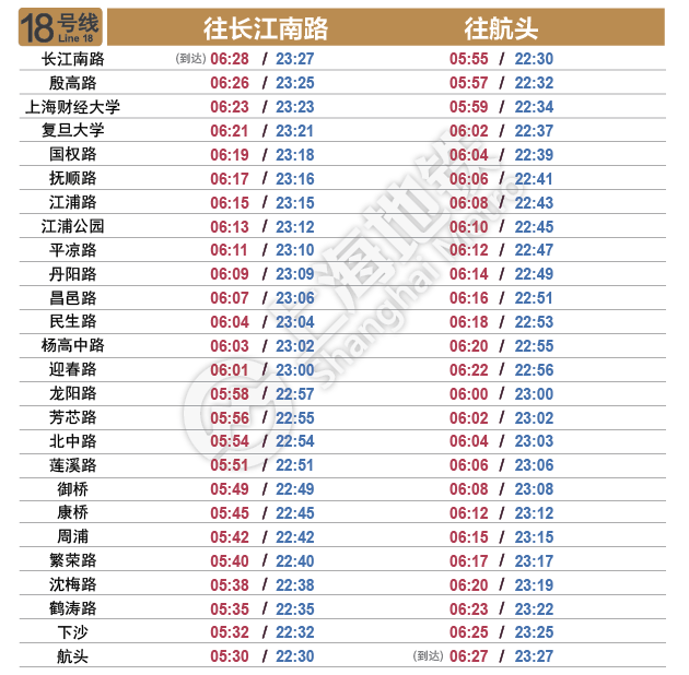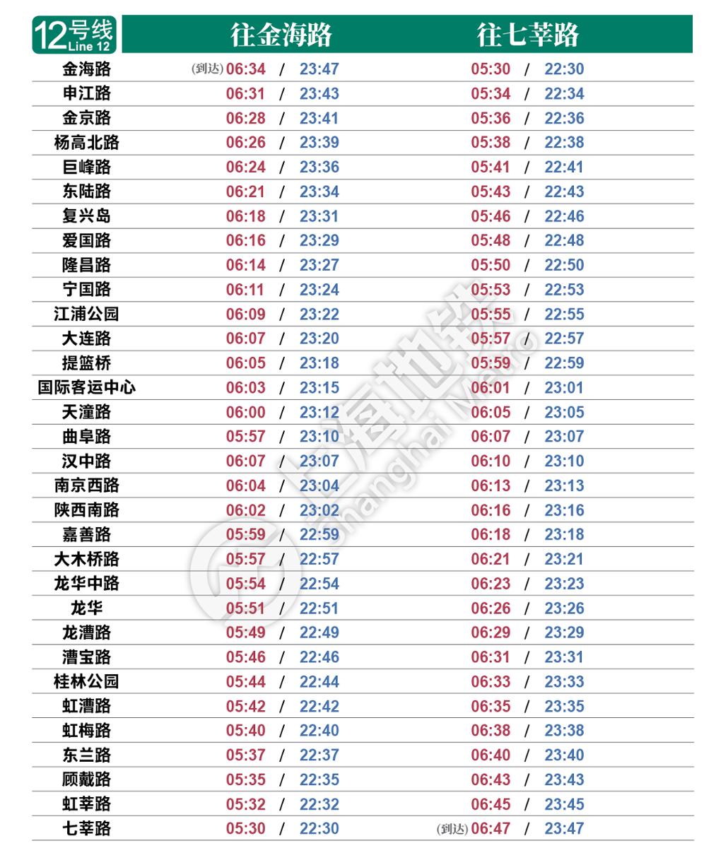 摘要: 上海地铁各条线路首末班车时间表,绿色时刻为延时运营末班车时间。
