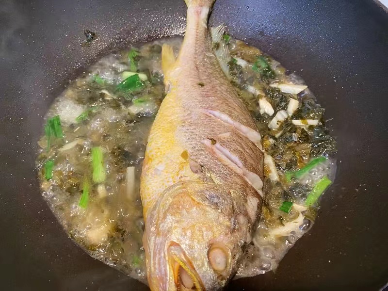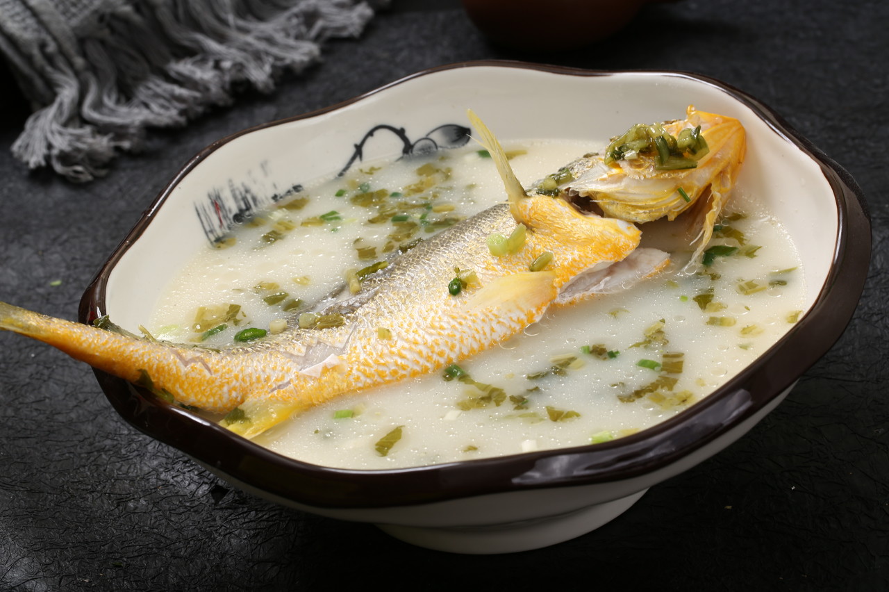 将上好的大黄鱼开膛破肚、料理干净,在爆香姜片的油锅里先煎后煮,最后放入切成小粒的雪菜,大火滚出白汤就能上桌。就是这样简简单单、原汁原味的一碗鱼汤,滋味却妙不可言。