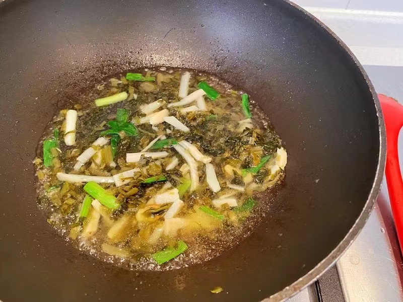 2、锅内下少许油,烧至七成热,倒入葱、笋丝、雪菜翻炒至雪菜出香味,装盘待用;
