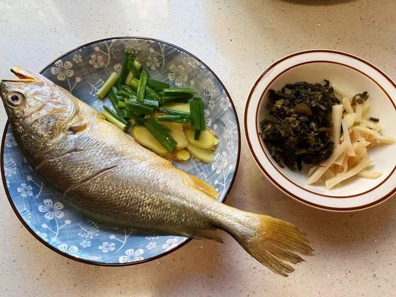 黄鱼1条,雪菜50克,姜、蒜、葱、冬笋适量。