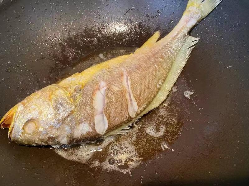 3、锅内下油,烧至七成热,放入黄鱼两边略煎;