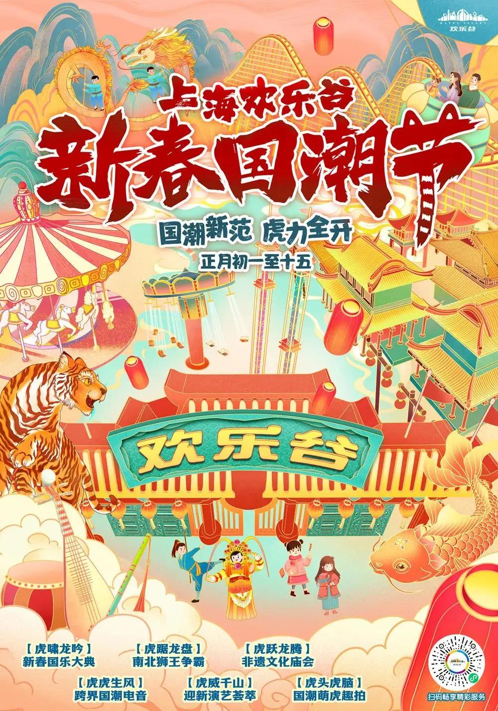 欢乐谷里过春节,国乐潮音、电音舞狮、非遗庙会、演艺荟萃、美食市集等活动齐上阵,还有超in萌虎打卡点带你玩转“虎”式春节。